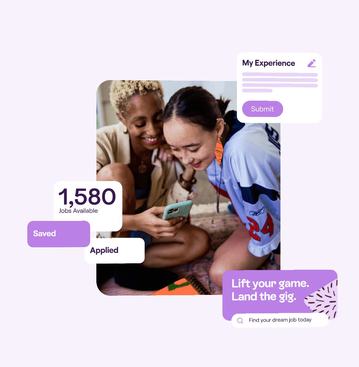 A modern job platform interface featuring a warm, inclusive photograph of people collaborating, overlaid with interactive UI elements in purple and white. The design combines human-centered imagery with clean digital components to create an approachable recruitment or career development experience.