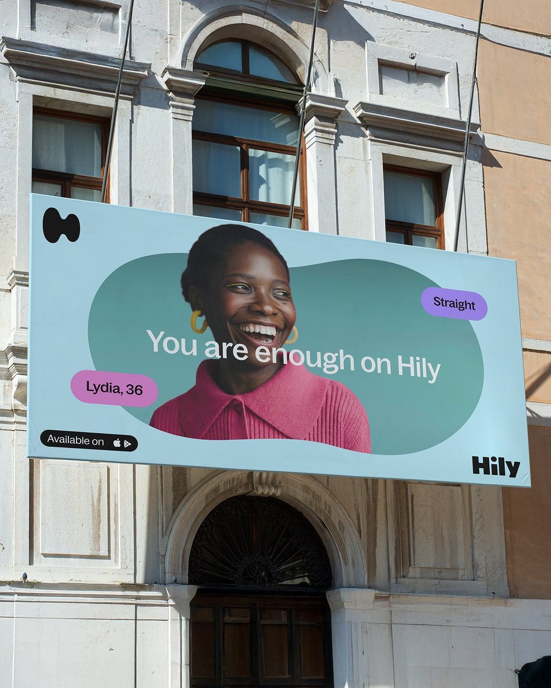 A contemporary digital billboard featuring a warm, inclusive portrait of a smiling woman against a soft color-blocked background. The design employs modern, accessible typography and playful UI elements to communicate an affirming message, creating an uplifting public art installation with a tech-forward aesthetic.