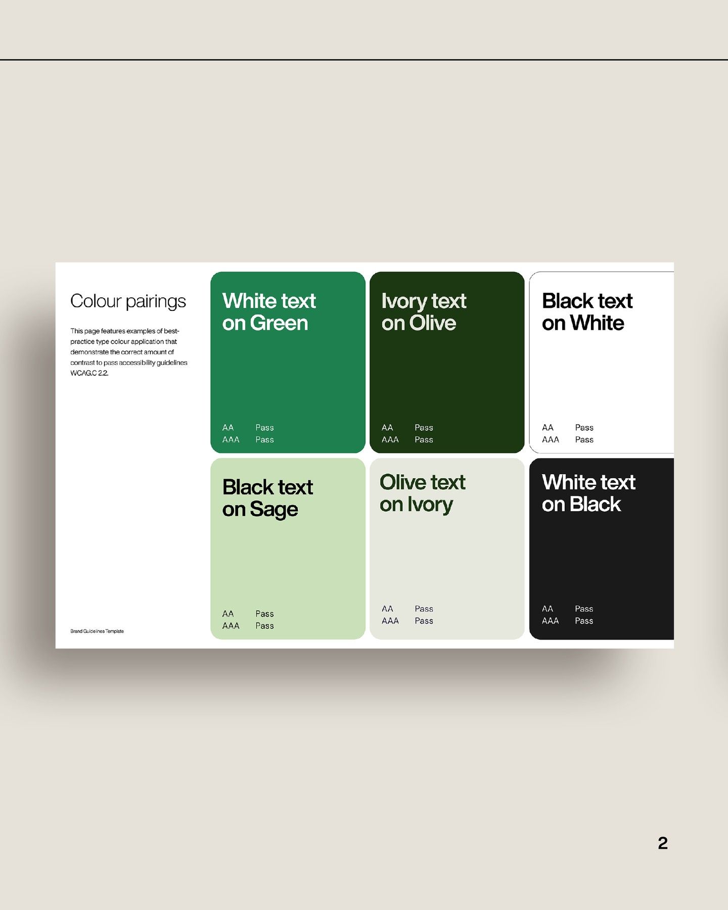 This design showcases a highly structured and minimalist approach to color contrast testing, utilizing clear modular blocks to demonstrate text legibility across various pairings. The visual language is clean and professional, prioritizing readability and accessibility standards through thoughtful use of muted, earthy tones.