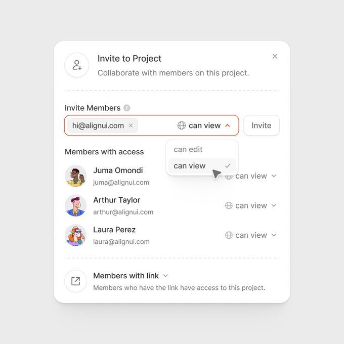 A clean, modern project collaboration interface featuring an invitation modal with member management functionality. The design uses a minimalist approach with soft shadows and rounded corners, emphasizing usability and clarity in a professional SaaS context.