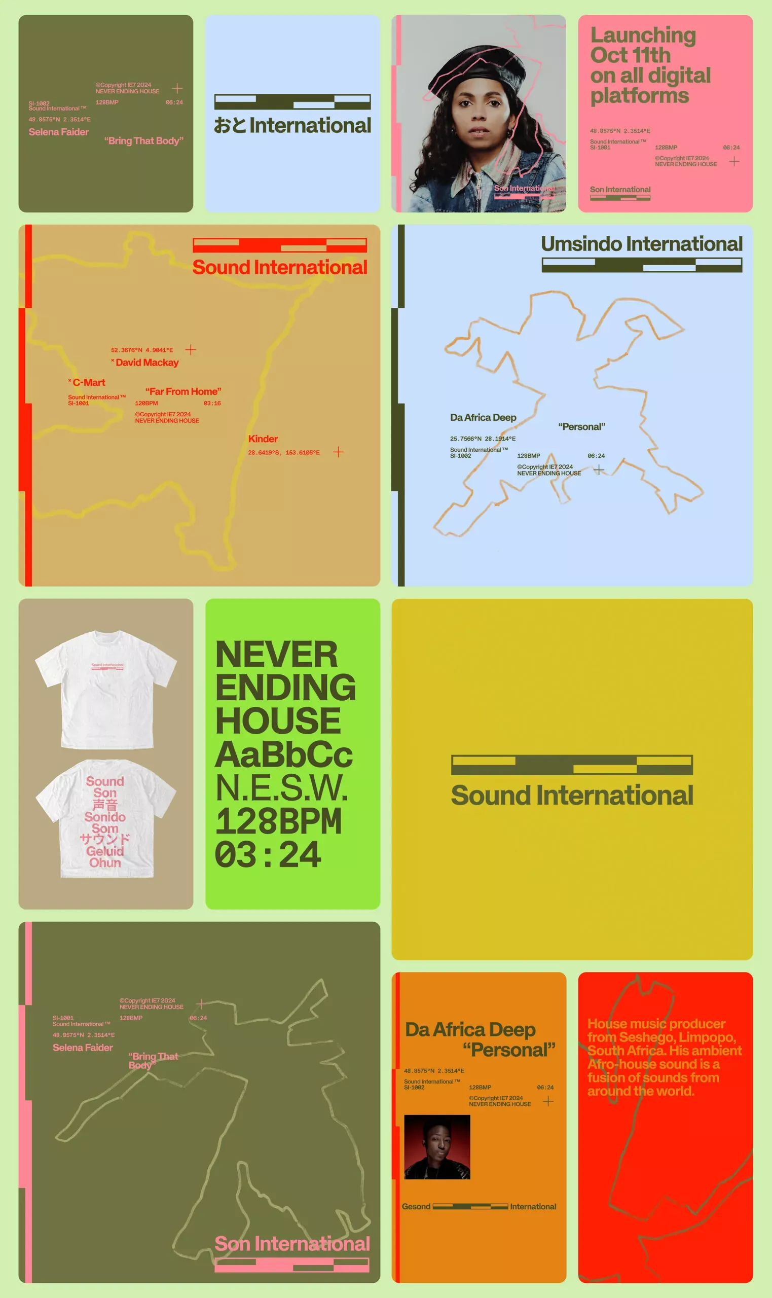 The image presents a cohesive, minimalist design aesthetic typical of music or event promotion, utilizing muted earth tones and strong graphic elements. The layout is structured with distinct rectangular sections, each dedicated to a specific entity or release, creating a clean and organized catalog feel.