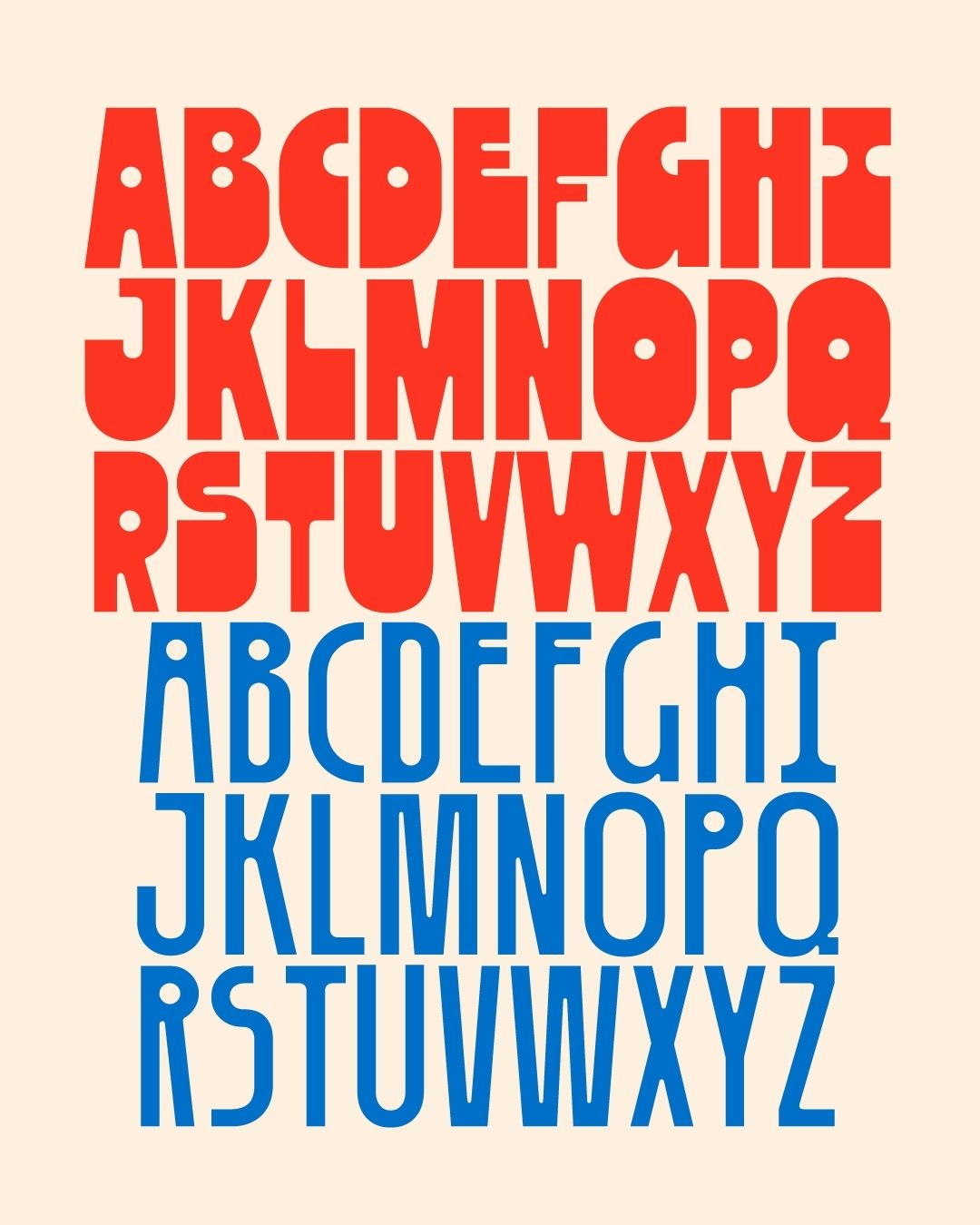This image is a typographic exploration using uppercase letters to form a complete alphabet, arranged in distinct blocks of color. The design is clean, bold, and highly structured, relying on the contrast between the vibrant red and deep blue elements against a neutral background.