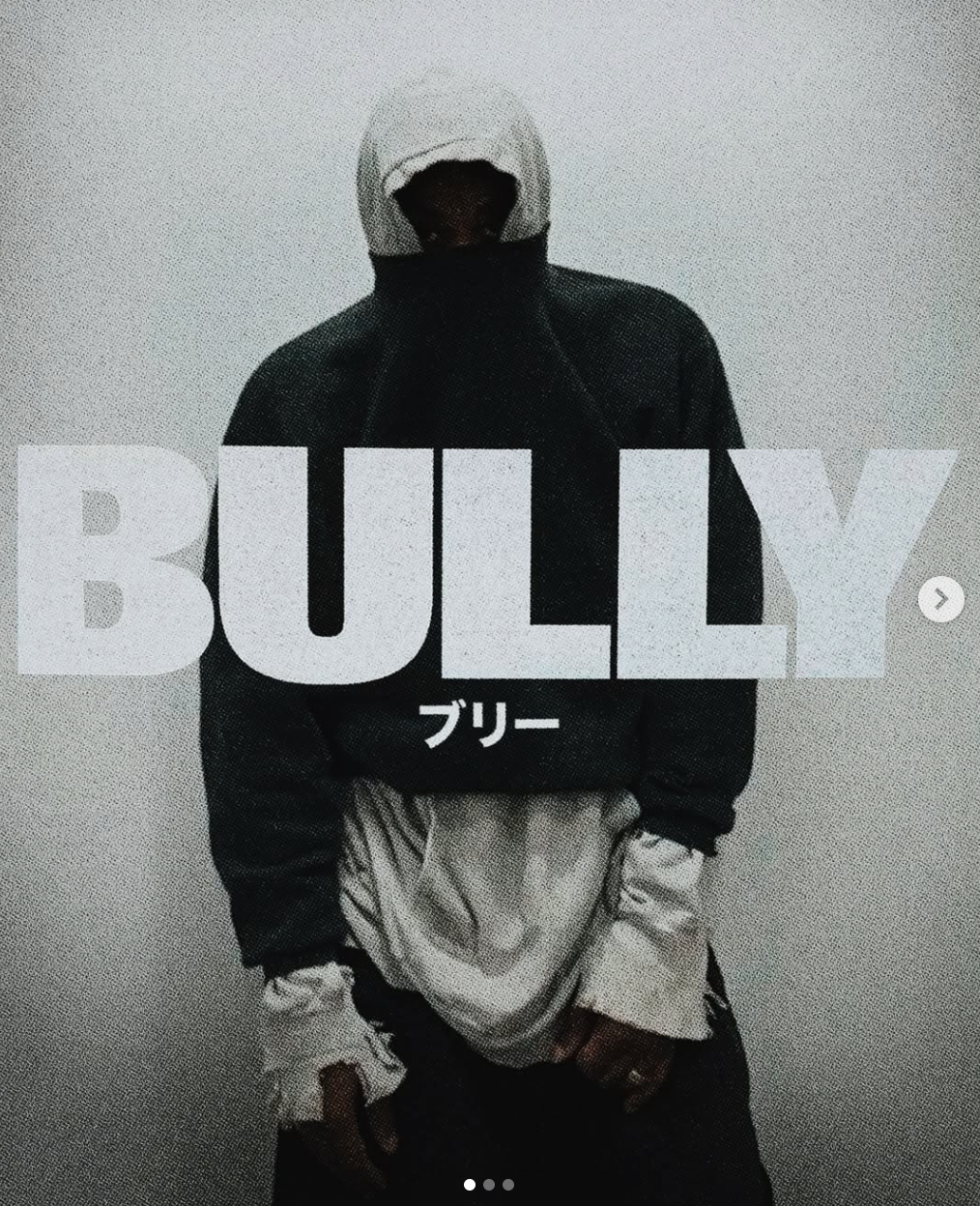 This image employs a stark, high-contrast monochrome aesthetic combined with bold typography to create an anonymous yet intense visual narrative. The composition focuses heavily on the texture of the dark clothing and the central figure, using negative space effectively to draw attention to the brand name.