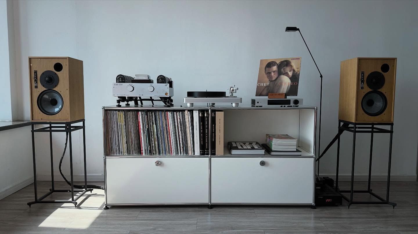 This composition showcases a curated display of vintage audio equipment, blending industrial metal stands with clean, modern cabinetry. The visual language emphasizes texture and functionality, creating a sophisticated yet nostalgic atmosphere perfect for an audiophile's setup.