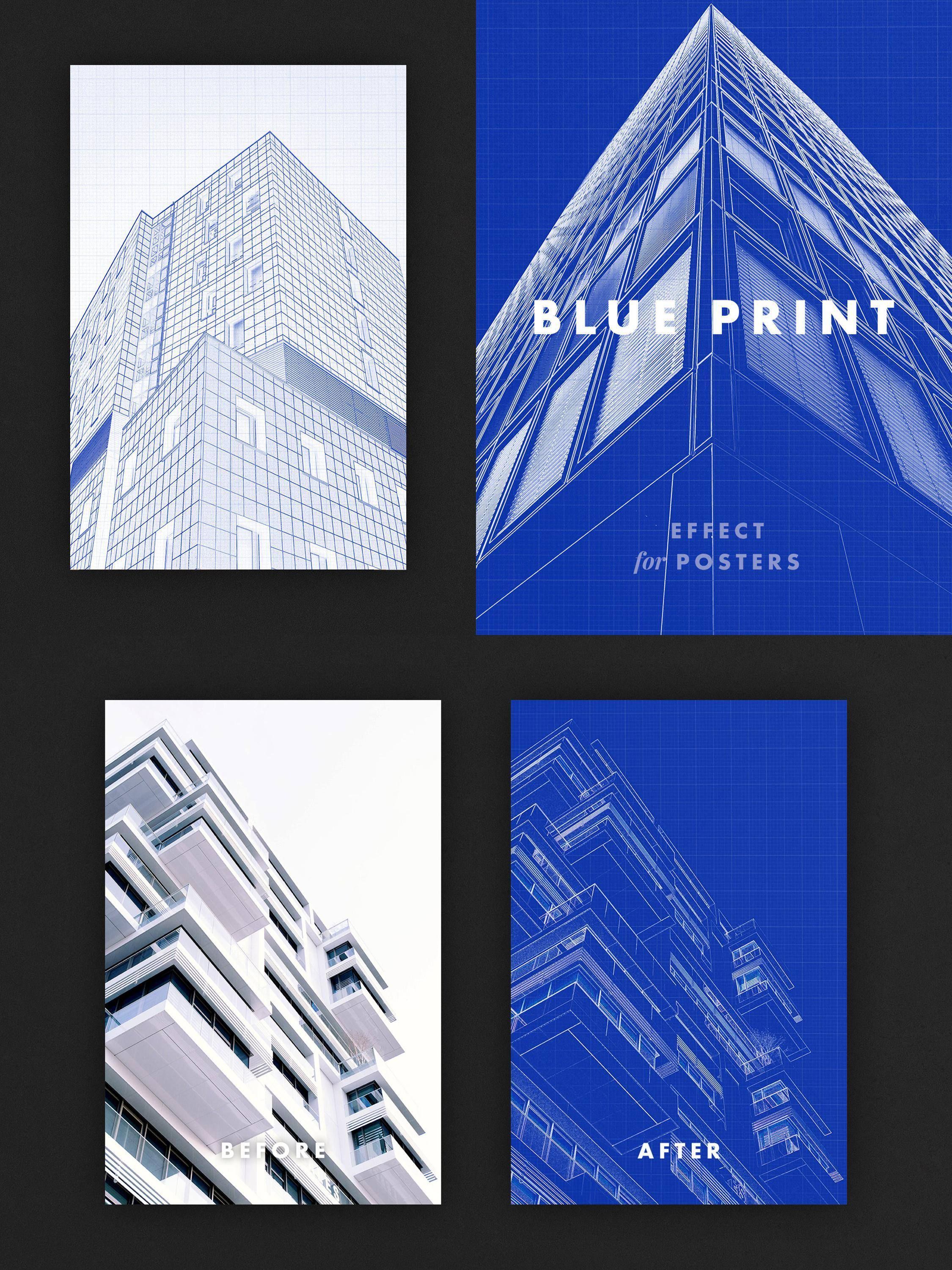 This visual presentation showcases a clean, modern aesthetic focused on architectural rendering and graphic design concepts. The imagery contrasts realistic building facades with stylized, technical blueprints, emphasizing transformation and precision in design work.