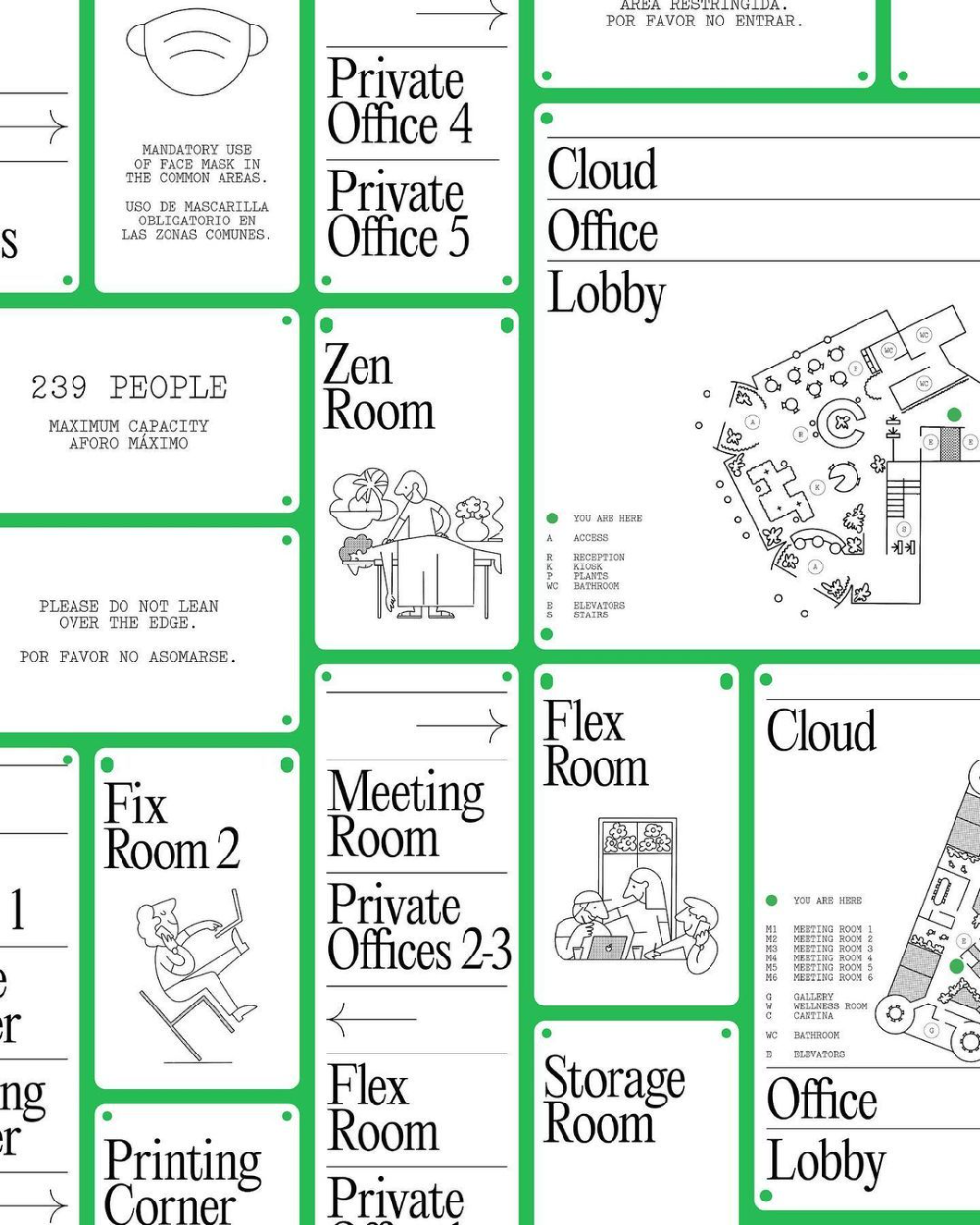 The image displays a schematic or floor plan layout, likely for an office or facility, characterized by a clean, functional, and somewhat institutional visual language. It uses simple line drawings and clear labeling to denote various rooms and amenities, suggesting a focus on spatial organization and accessibility.
