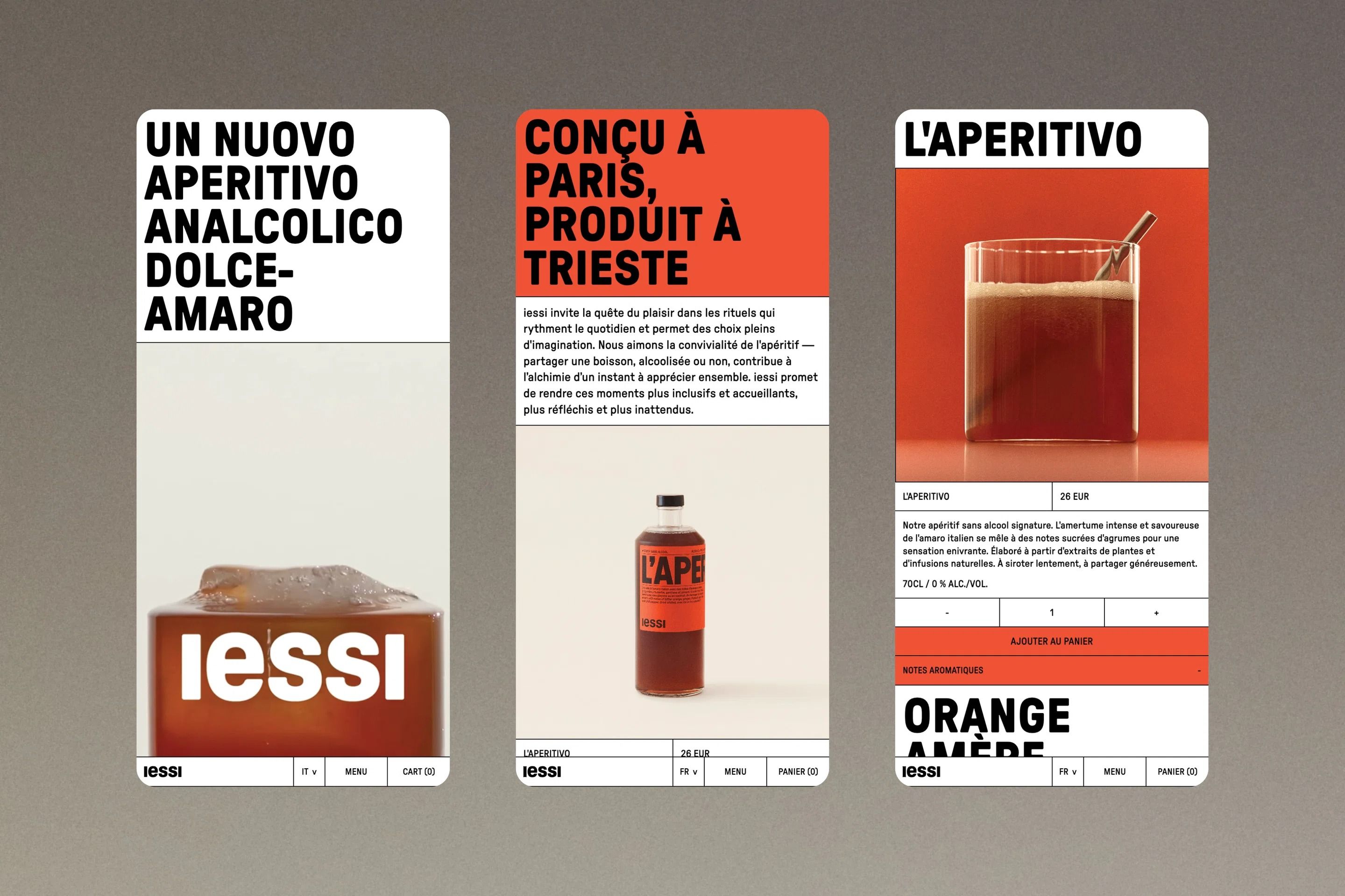 A modernist product marketing campaign featuring three vertical cards with bold typography and minimalist layouts. The design employs a Swiss-style grid system with stark contrasts between white, red, and beige backgrounds, showcasing Italian aperitivo bottles with clinical precision and editorial sophistication.