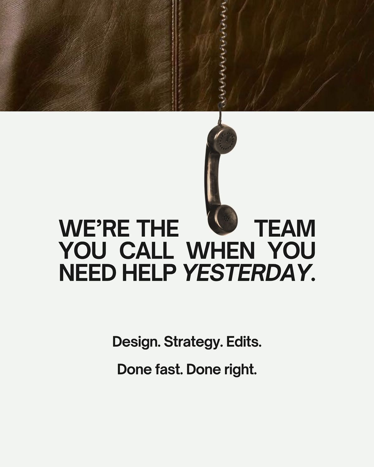 A minimalist service-oriented design featuring a vintage telephone handset as a central visual metaphor for communication and support. The composition balances bold typography with clean white space, emphasizing reliability and accessibility through a nostalgic yet contemporary aesthetic.
