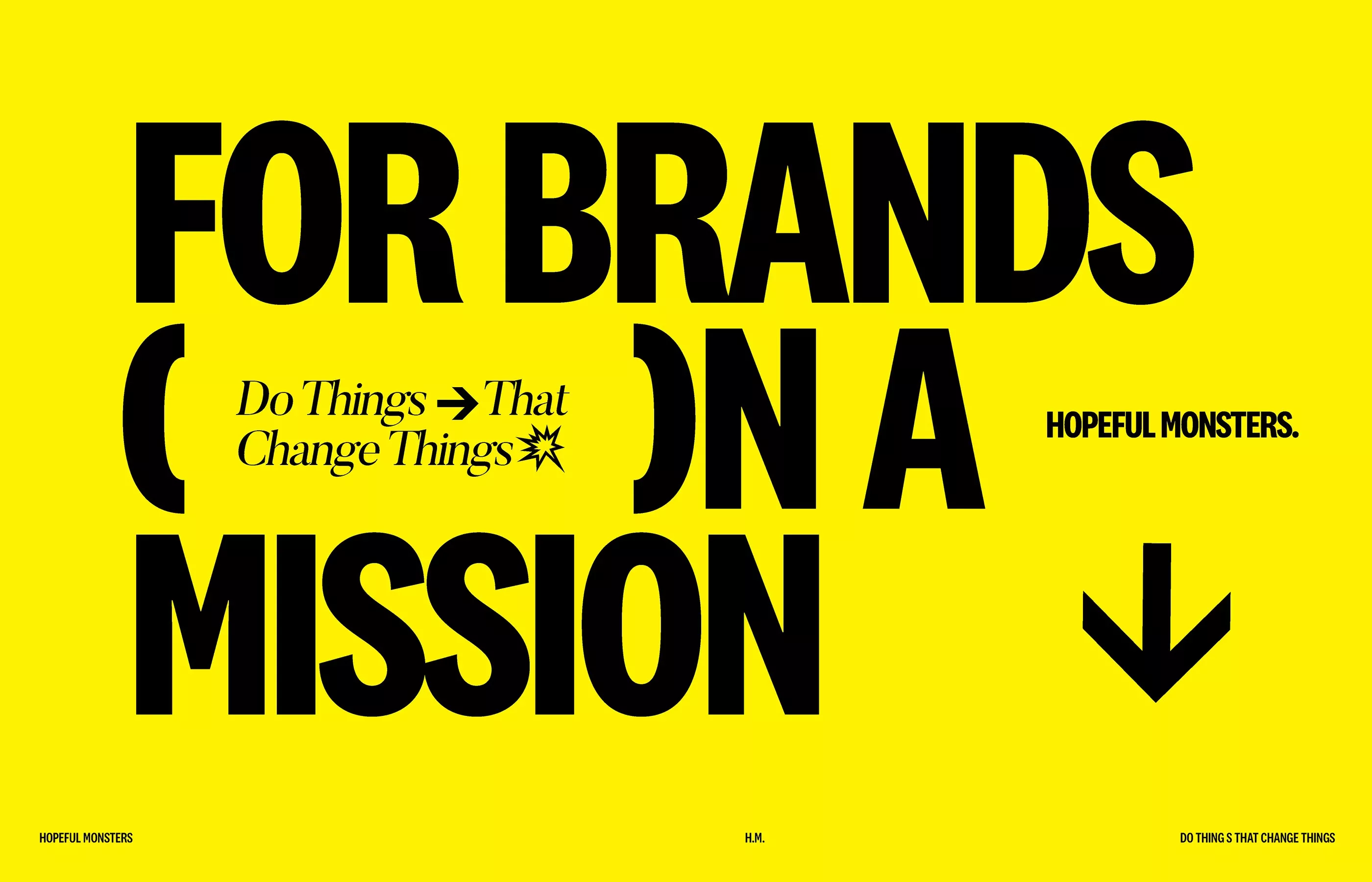 A bold, high-contrast typographic design featuring large black sans-serif text on a vibrant yellow background. The layout combines fragmented messaging with directional arrows and smaller supporting text, creating a dynamic and attention-grabbing visual hierarchy that emphasizes mission-driven branding.
