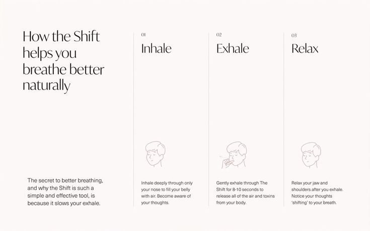 The image presents a clean, minimalist instructional layout using white space effectively to separate three distinct steps. The visual language is calm and direct, relying on simple iconography and clear typography to convey a breathing technique.