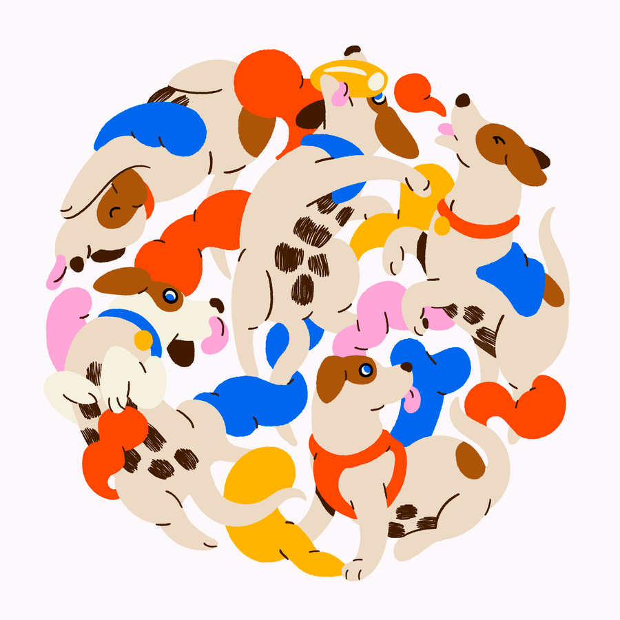 This is a vibrant and playful illustration featuring a dense cluster of stylized dog heads, likely puppies. The visual language relies on soft shapes and warm tones accented by bright primary colors, creating a charming and innocent atmosphere. The overall feel is cheerful and friendly.