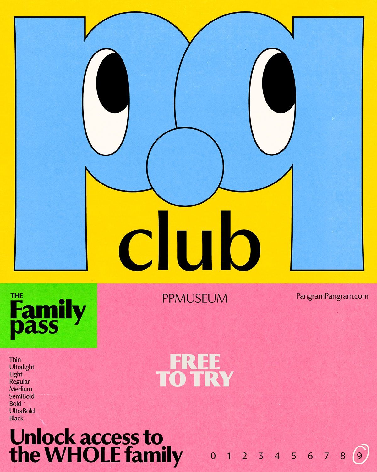 A vibrant, playful poster featuring a bold blue cartoon character with exaggerated oval eyes and a yellow mouth, set against a bright yellow background. The design combines retro digital aesthetics with contemporary graphic design, promoting a family pass to a museum with a friendly, approachable visual language.