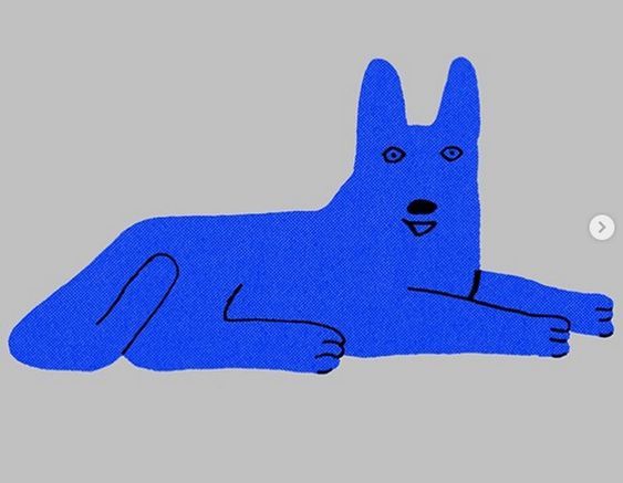 This design features a highly simplified, flat illustration of a blue dog, utilizing thick outlines and solid color blocking. The visual language is extremely minimalist and friendly, relying on basic shapes to convey a sense of calm simplicity.