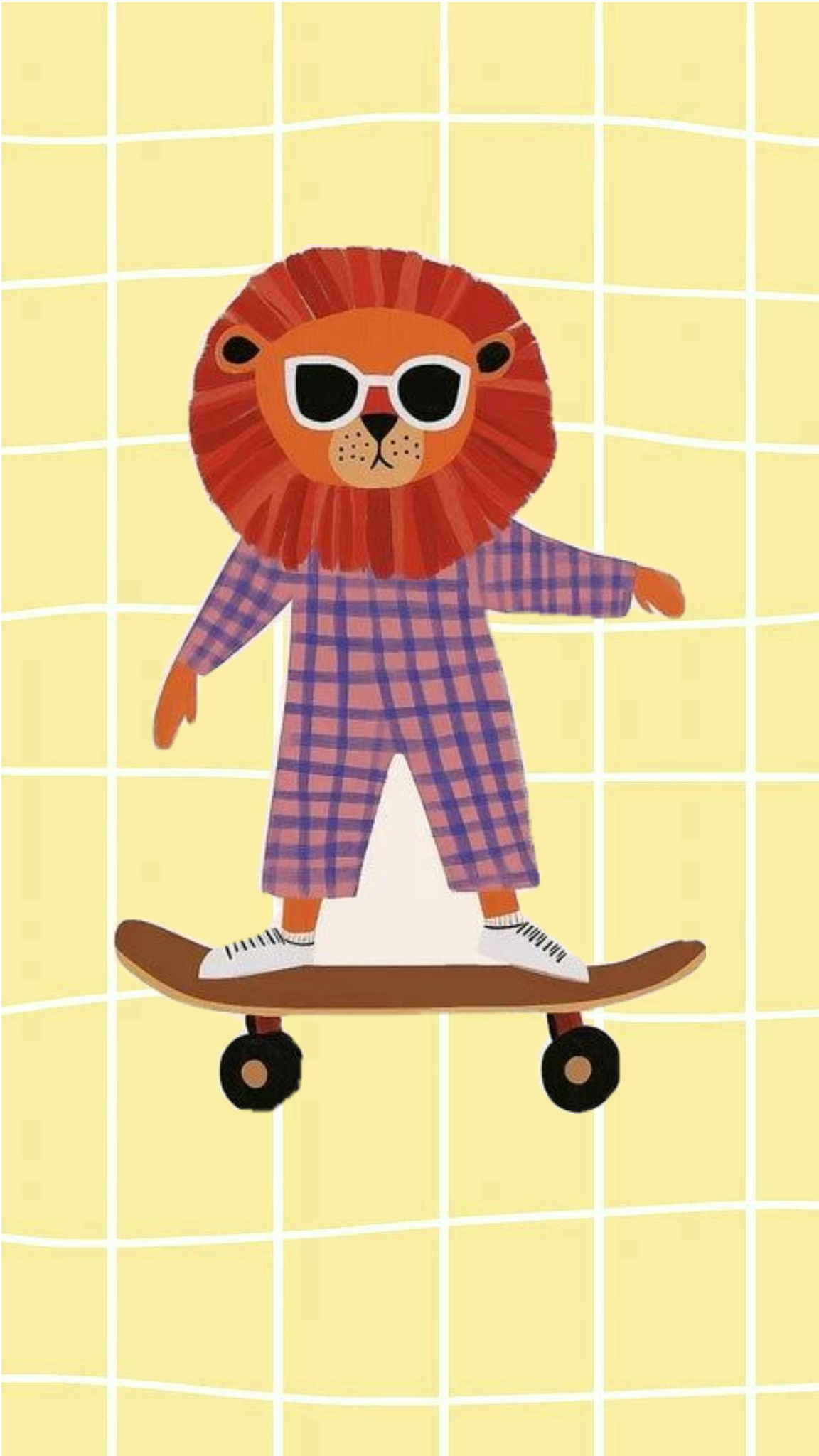 This illustration utilizes a flat, vector style to depict an anthropomorphic lion character in casual attire, blending animal features with modern elements like sunglasses and a skateboard. The visual language is bright and clean, employing simple shapes and distinct patterns to create a playful and whimsical aesthetic.