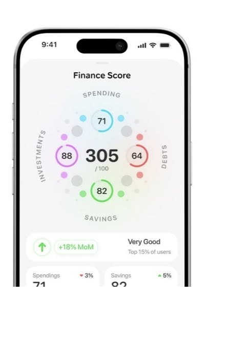 The design presents a clean, modern mobile interface focused on displaying a financial score through a circular visualization. It uses a light background with vibrant, yet soft, accent colors to guide the user's eye toward key metrics and performance indicators.