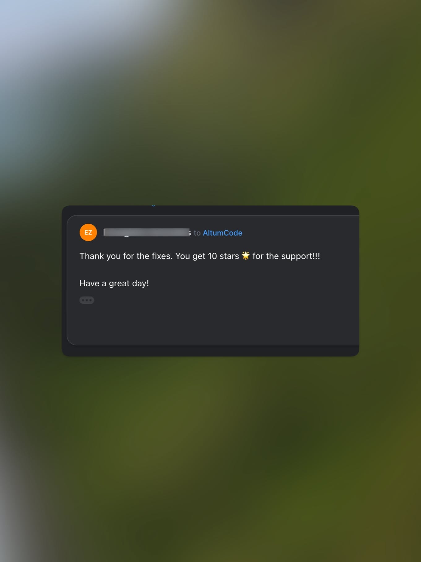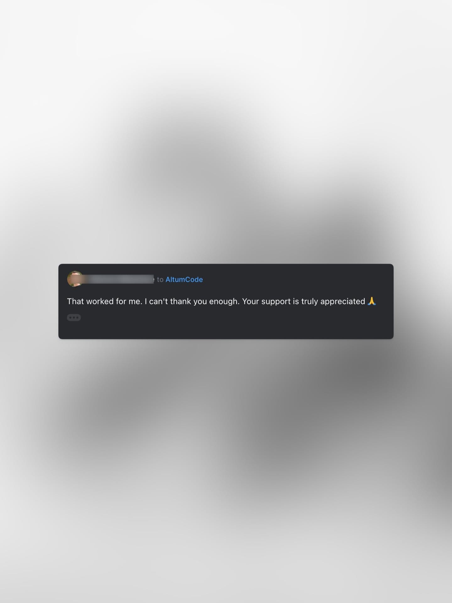 This design features a clean, dark-themed interface presenting positive user feedback and a thank you message. The visual language is minimalist, relying on high contrast between the dark UI elements and a soft, blurred background.