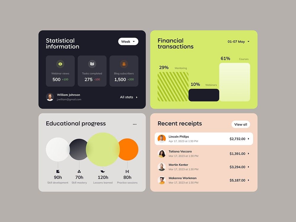 This image showcases a clean, modern dashboard design utilizing card-based layouts to present statistical and financial data. The visual language is minimalist, relying on clear typography and subtle color accents to ensure high readability and data hierarchy. The overall feel is professional, organized, and highly functional.