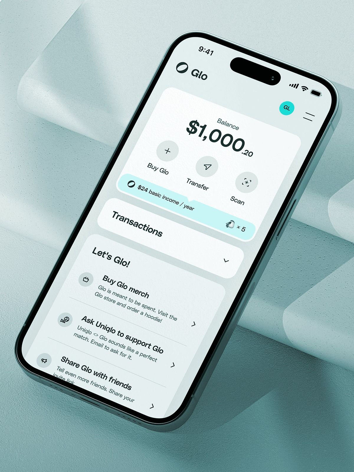 This interface showcases a clean, modern mobile application design characterized by ample white space and clear visual hierarchy. The layout is highly organized, using subtle color accents to guide the user through key financial actions and information.