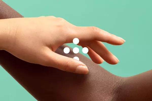 This image features a close-up shot of a hand interacting with a dark, possibly skin-toned surface, marked by several small white dots. The composition is clean and focused, emphasizing texture and subtle interaction.