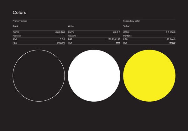 This image is a technical color reference chart, presenting primary and secondary colors in various formats (CMYK, Pantone, RGB, HEX) alongside large circular swatches. The design is clean, minimalist, and highly functional, typical of a design system or color guide.
