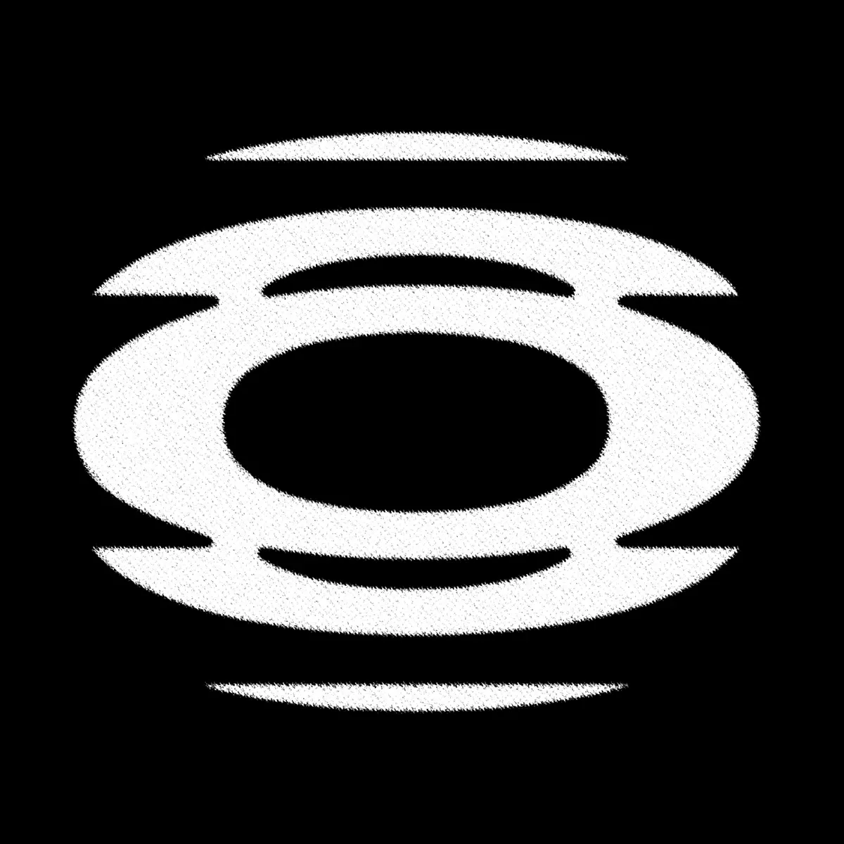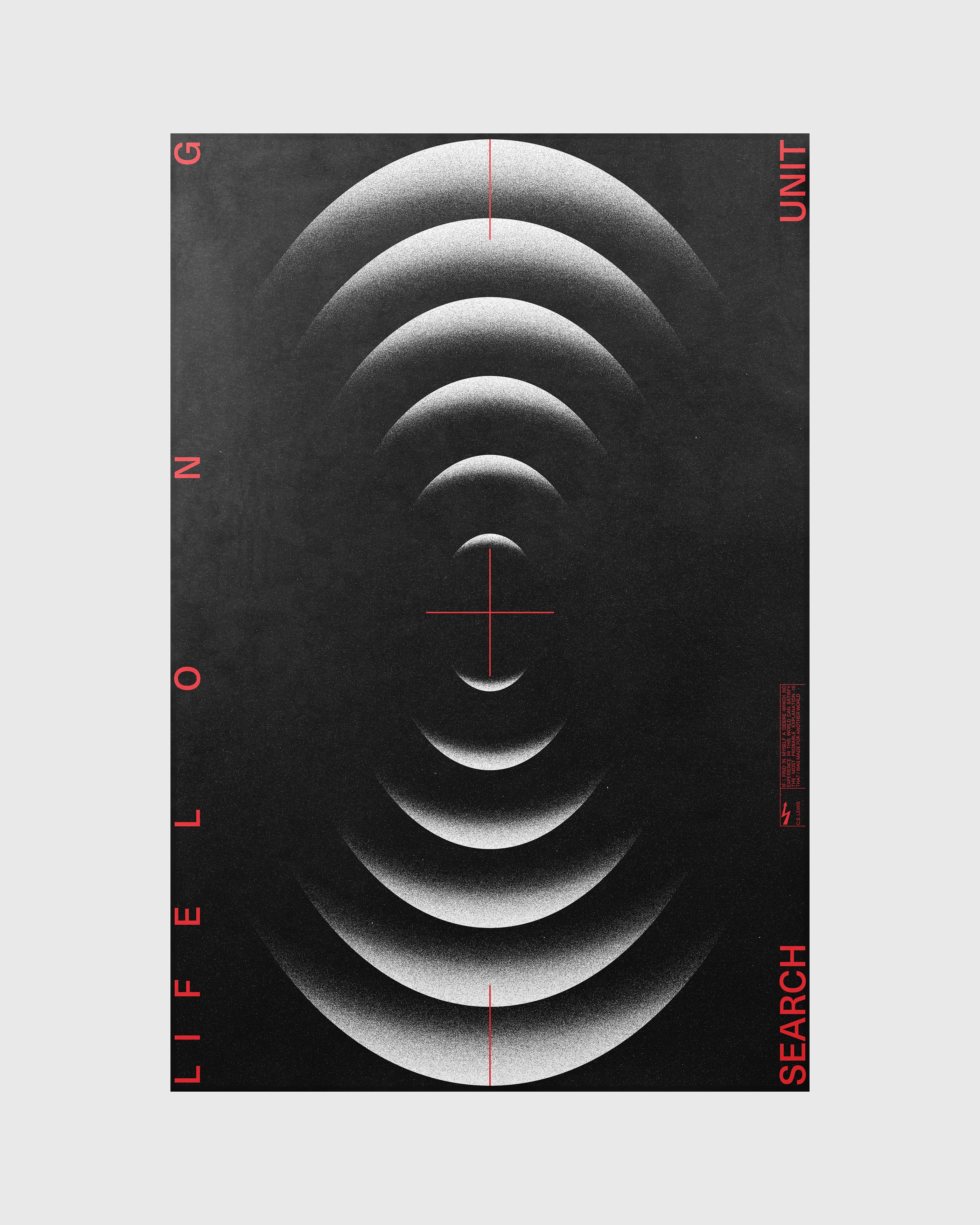 This is a stark, minimalist graphic design featuring concentric circles radiating from a central point, creating a strong sense of depth, focus, and perhaps a scientific or meditative theme. The monochromatic palette emphasizes form and negative space to achieve a highly structured and intense visual experience.