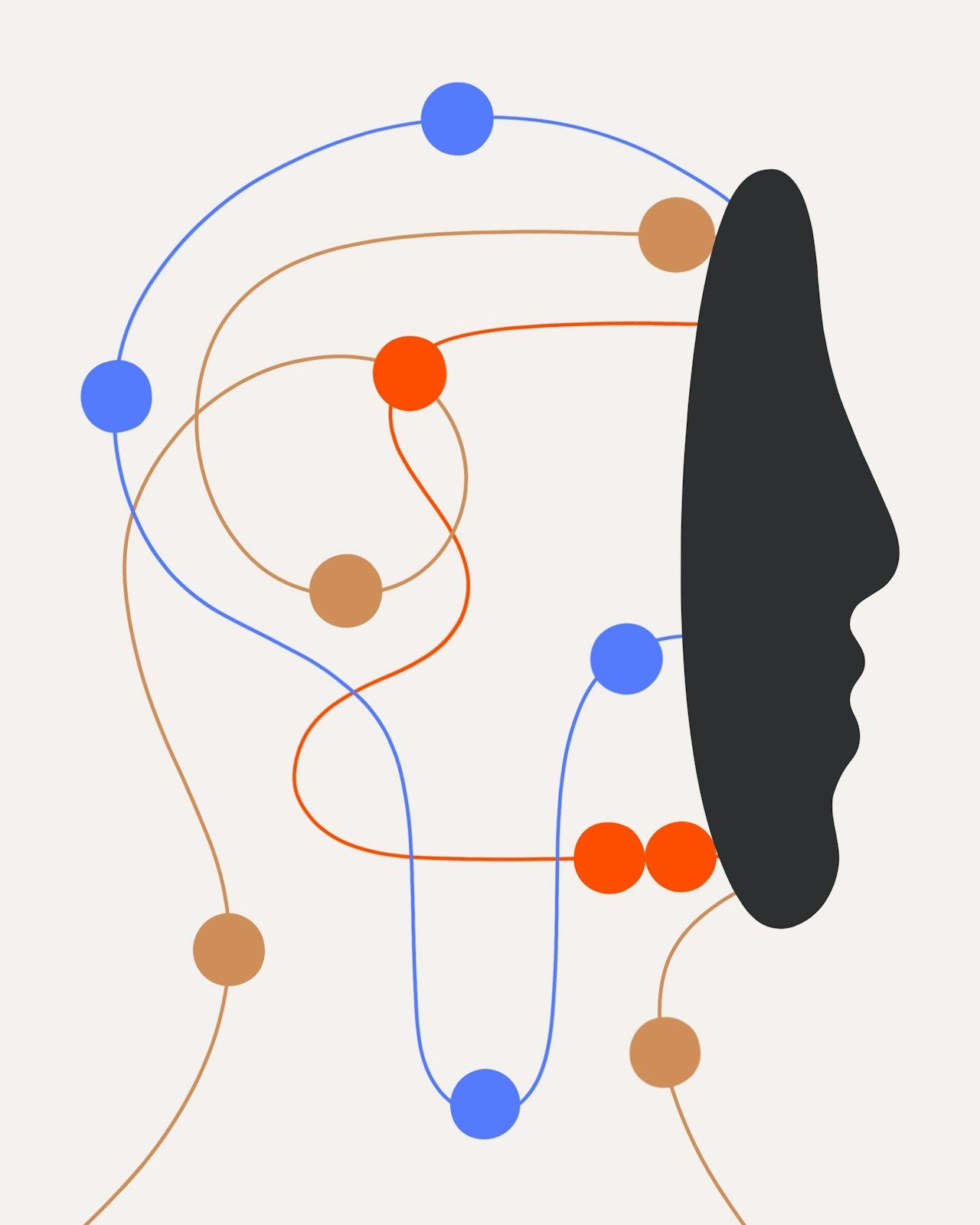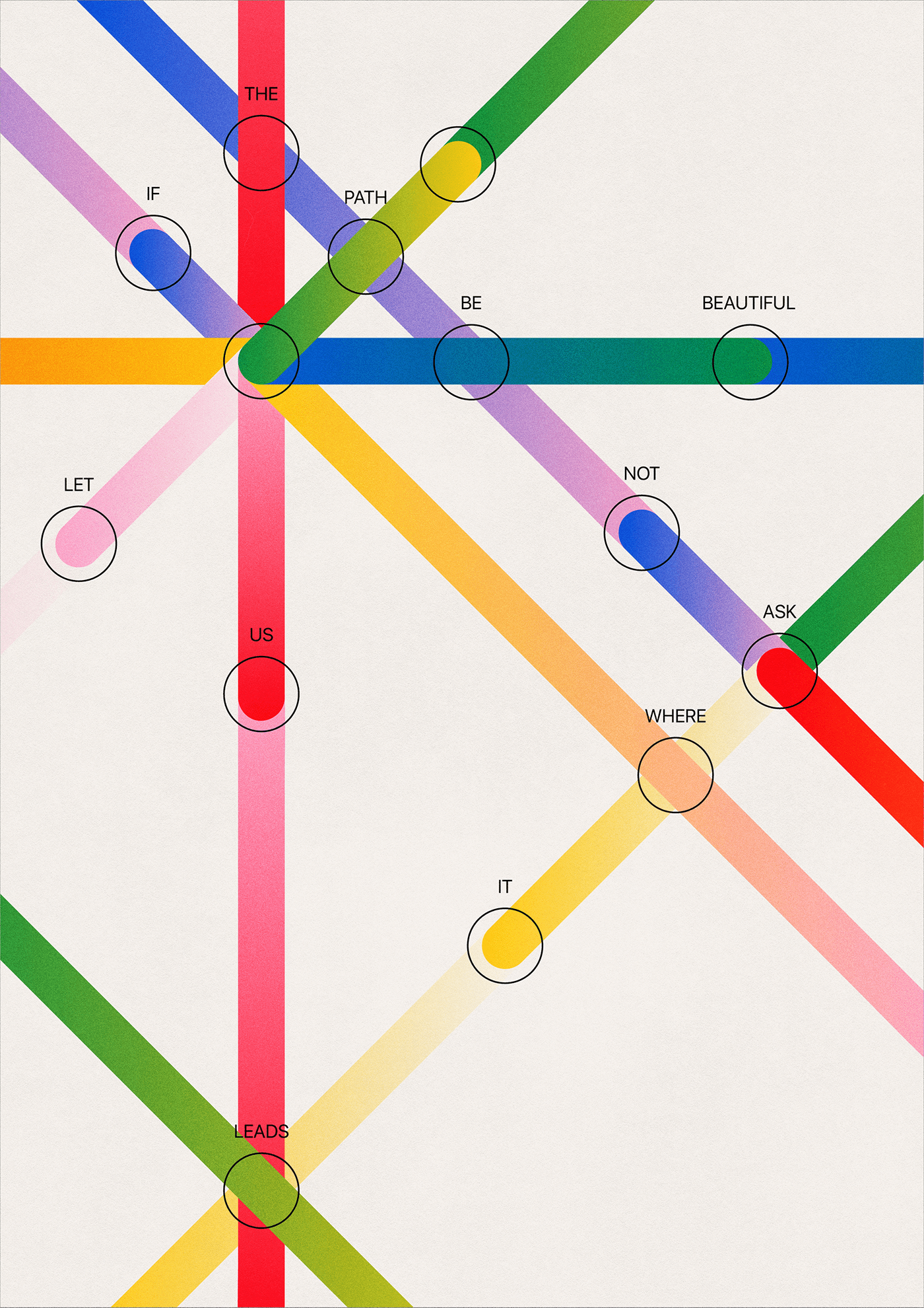This image presents a vibrant, abstract diagram utilizing intersecting lines and colored nodes to illustrate conceptual relationships between various terms. The visual language is clean and structured, relying heavily on color coding to differentiate pathways and connections.
