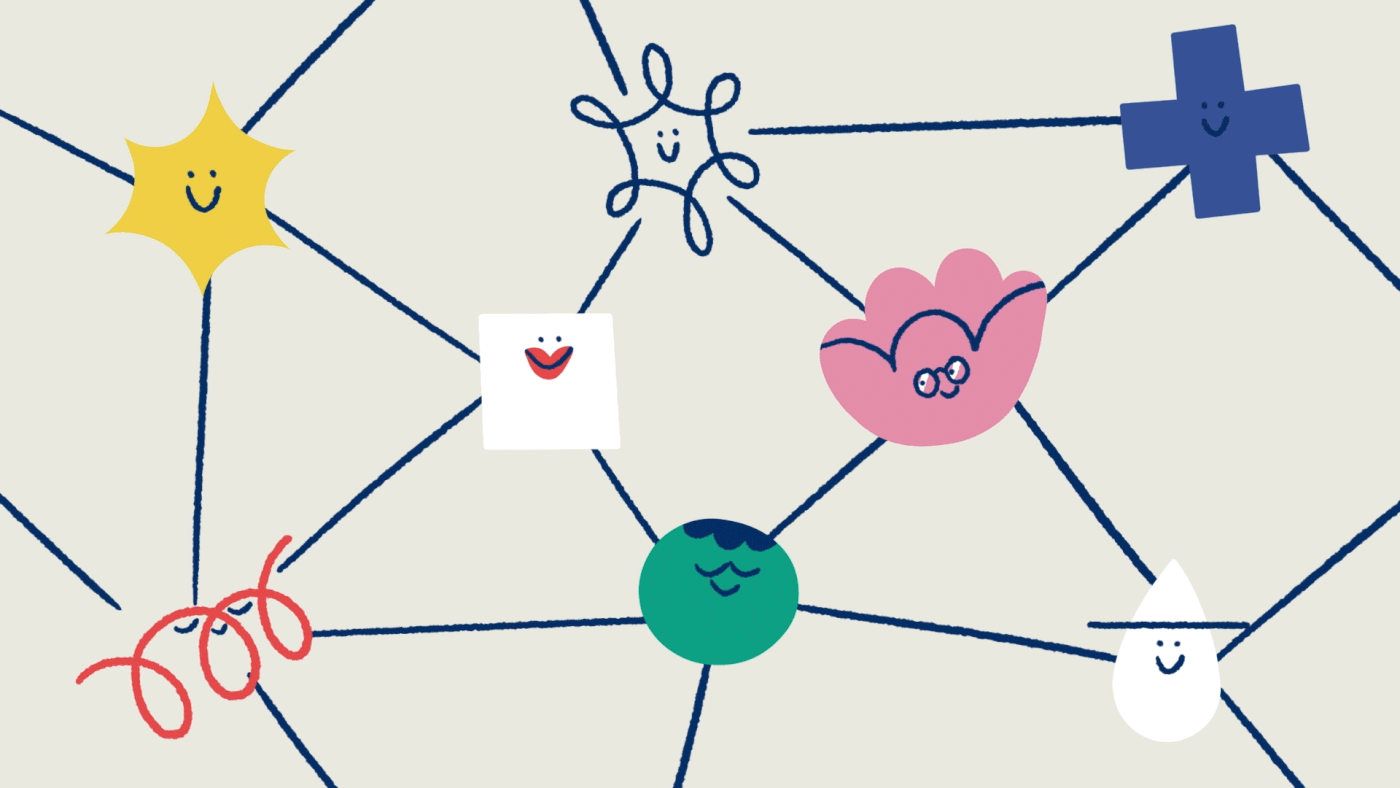 This image presents a minimalist, hand-drawn style network or connection diagram using simple, expressive icons. The visual language is lighthearted and friendly, relying on organic lines and cheerful shapes to suggest relationships or data flow.
