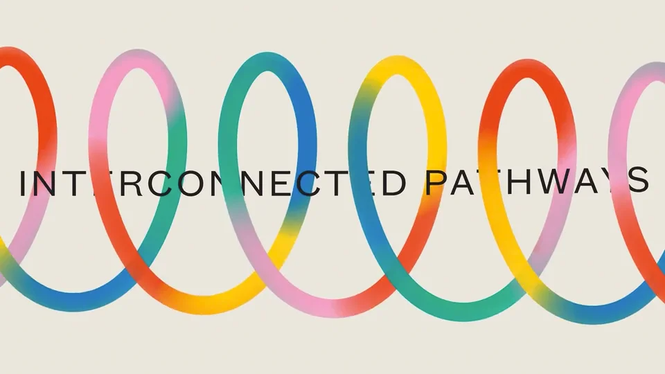 The image features a vibrant, continuous line graphic composed of interlocking, elongated rings, suggesting connectivity and pathways. The design uses a smooth, modern aesthetic with a gradient effect across the colors, conveying a sense of fluidity and technological integration.