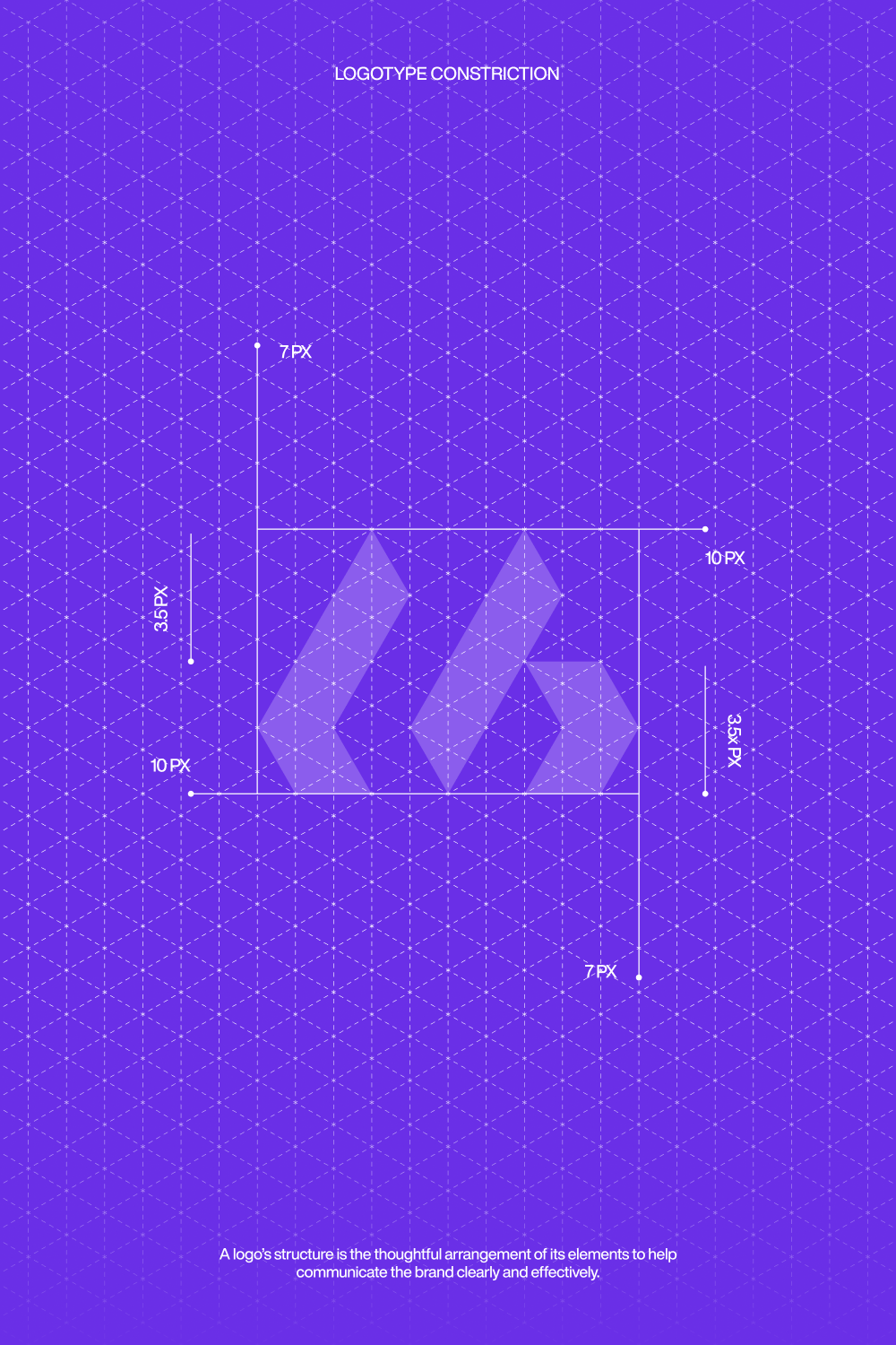 A technical blueprint-style design featuring geometric logo construction on a vibrant purple gradient background with hexagonal grid pattern. The composition demonstrates precise proportional guidelines and measurement annotations, creating a professional, systematic approach to logo design documentation.