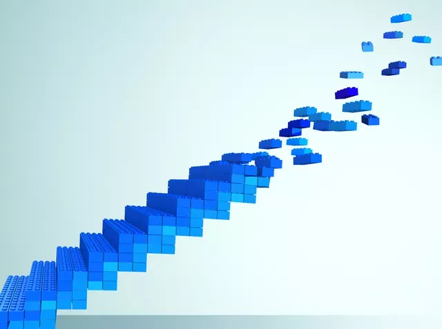 This abstract rendering uses geometric blocks to depict a sense of progression or growth, moving diagonally across the frame. The clean lines and consistent blue hue establish a modern, structured visual language suitable for data representation or conceptual illustration.