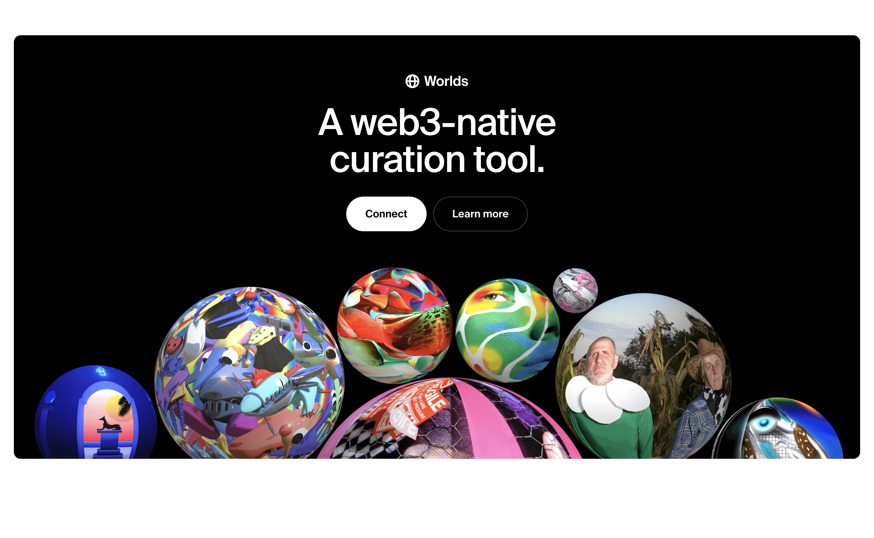 The image presents a dark, minimalist interface featuring a title and several spherical, colorful, abstract objects that suggest data curation or digital assets. The visual language is modern and tech-focused, using vibrant spheres against a stark black background to draw attention to the curated elements.