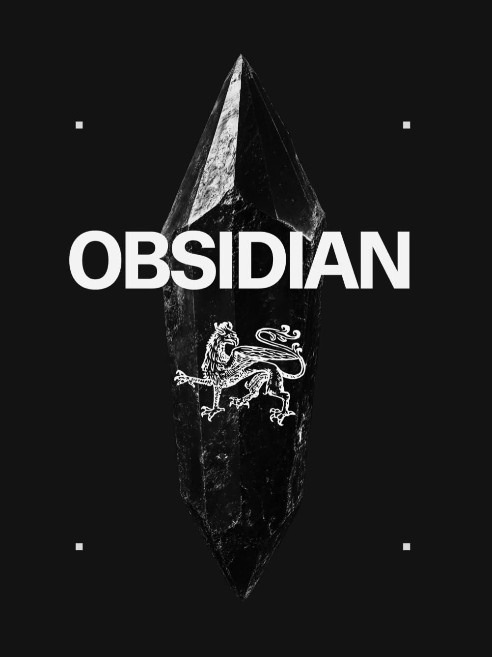 This is a stark, high-contrast graphic design featuring a sharp, dark crystal or shard shape dominating the frame. The design employs minimalist typography and a detailed silhouette of a lion, creating an intense and somewhat dark aesthetic.