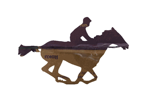 This image is a silhouette rendering of a rider on a horse, characterized by a dark, monochromatic form against a muted background. The design relies heavily on negative space and the strong contrast between the solid shapes, creating a stark and somewhat rustic visual narrative.