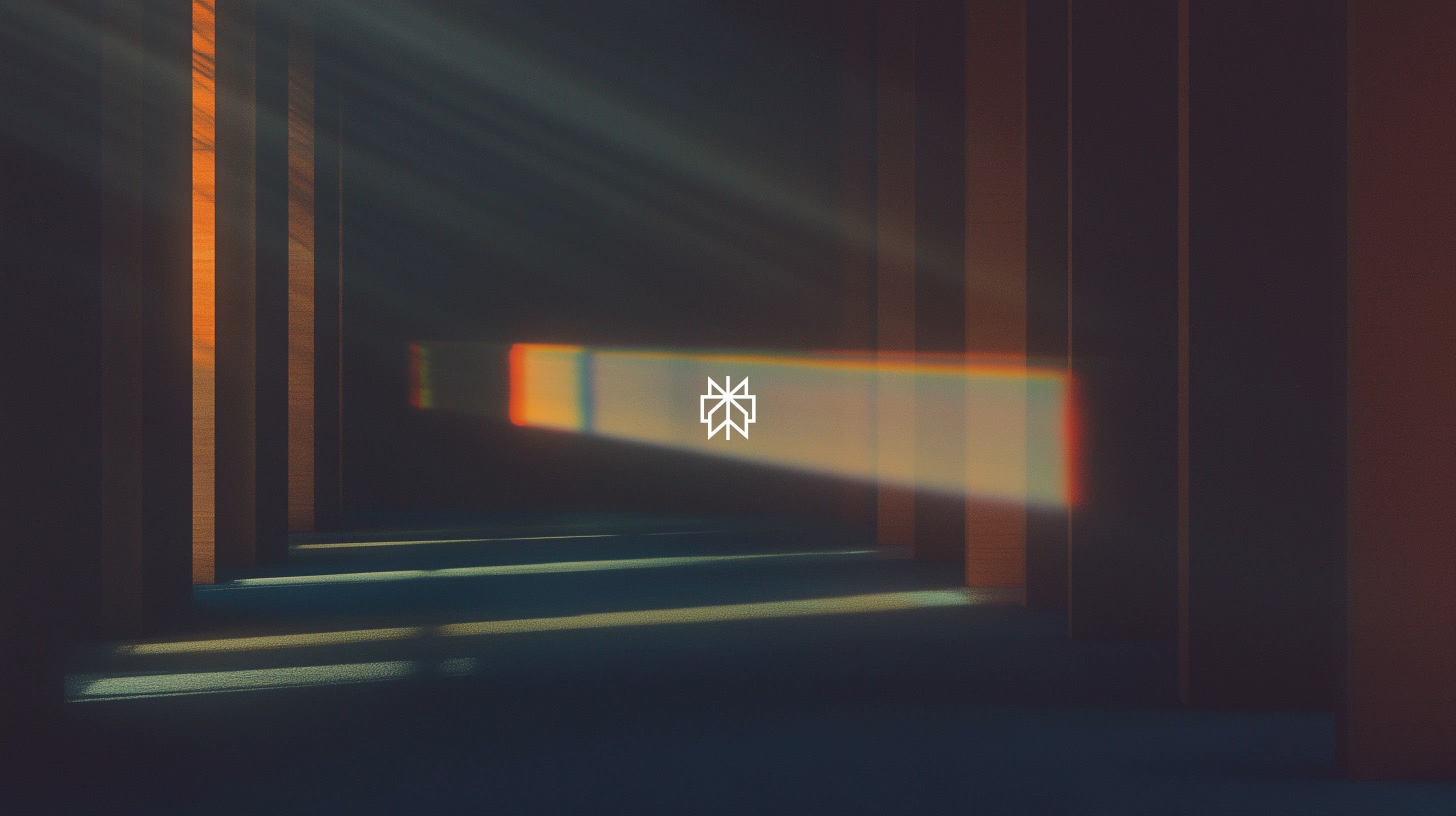 This image presents a minimalist, deeply shadowed composition characterized by strong vertical lines and dramatic light shafts. The visual language relies heavily on contrast between deep blacks and warm, diffused orange/amber highlights, creating a sense of depth and ethereal illumination.