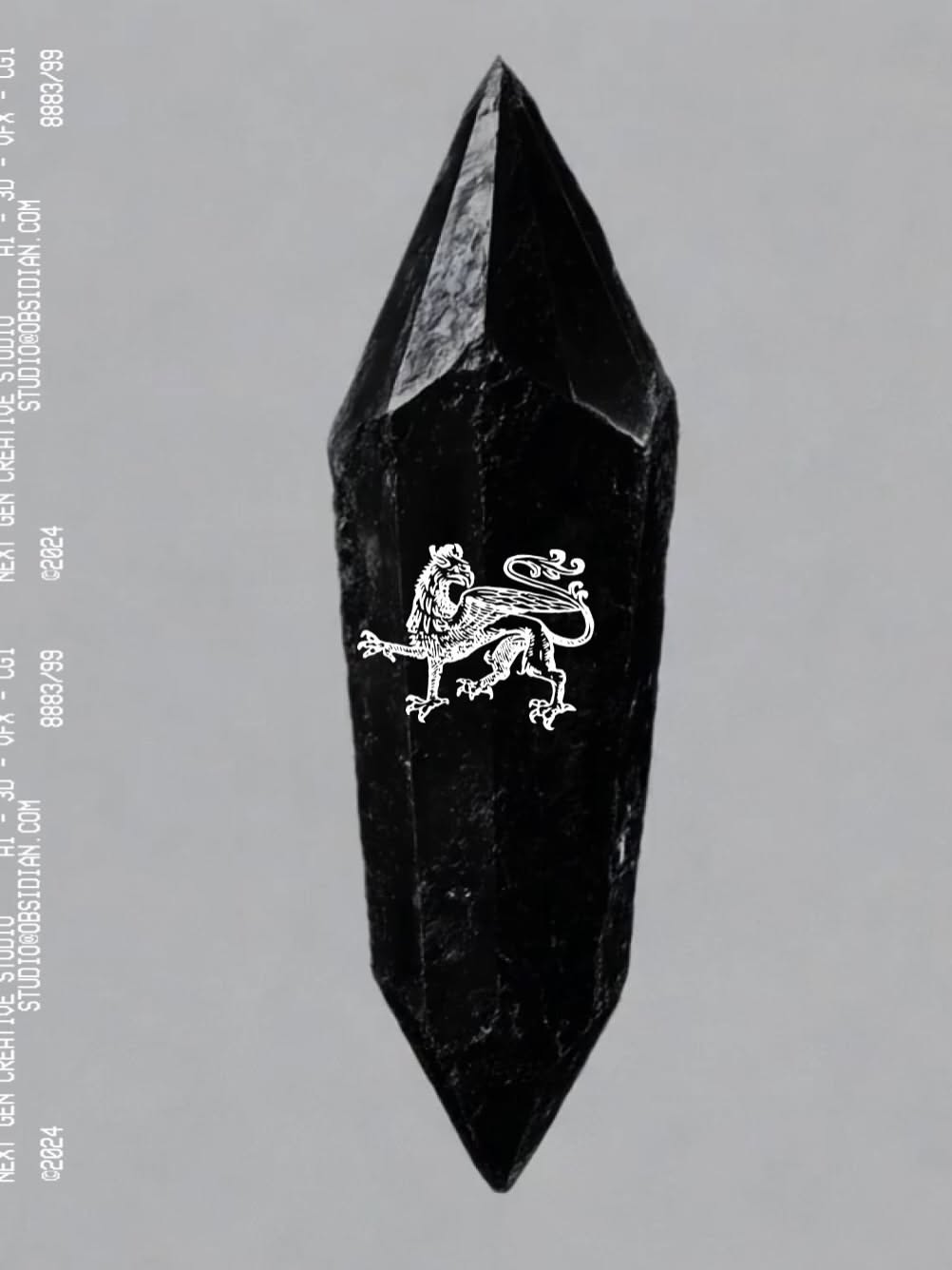 This image features a striking, dark, pointed crystal or mineral specimen set against a neutral gray background. The design emphasizes sharp geometry and the intricate detail of an engraved motif, conveying a sense of ancient power or refined craftsmanship.