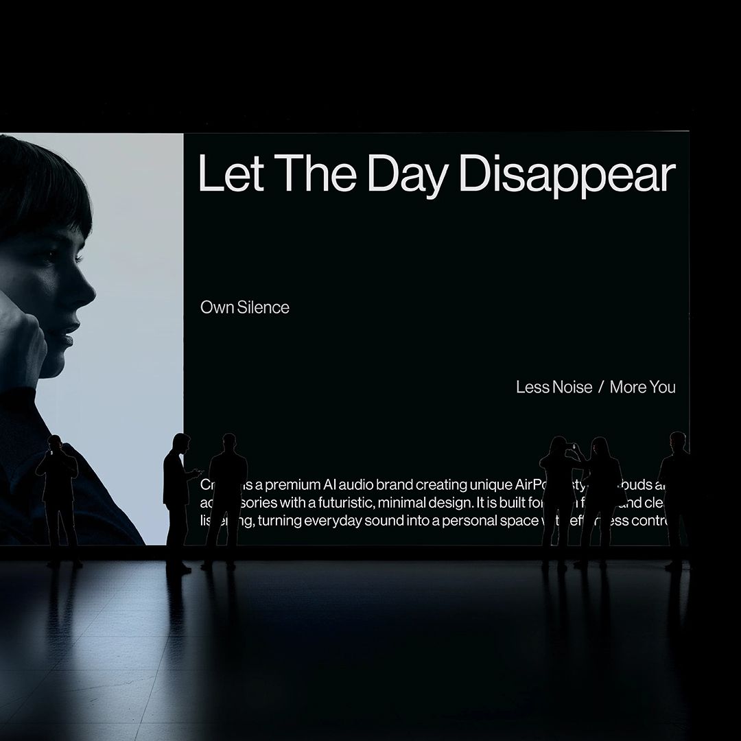 The image presents a sleek, high-contrast product shot emphasizing minimalist design and sophisticated technology. The lighting is controlled, creating deep shadows and sharp highlights that focus attention entirely on the subject's profile and the product integration.