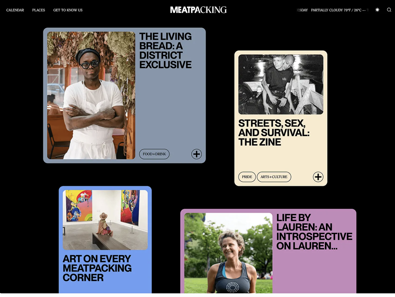 The image displays a clean, modern digital interface, likely for a publication or media platform called 'Meatpacking,' featuring distinct content cards with high-contrast photography and minimalist text overlays. The design balances photographic elements with structured layout to present diverse, perhaps edgy or journalistic content.