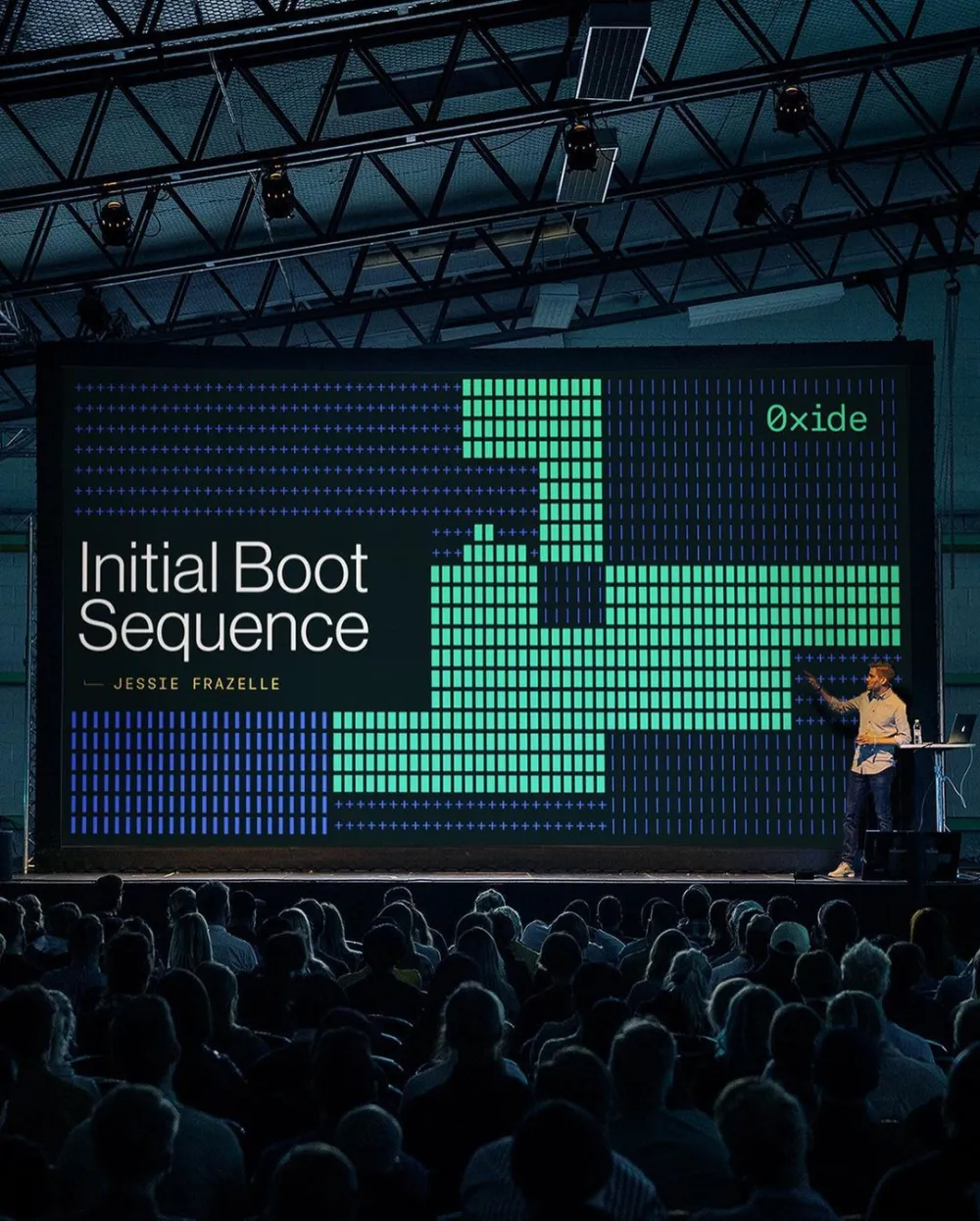 This image captures a high-tech, futuristic presentation where digital graphics dominate the visual field against a dark backdrop. The design successfully merges abstract data visualization, clean geometric patterns, and human presence into a cohesive technological narrative.