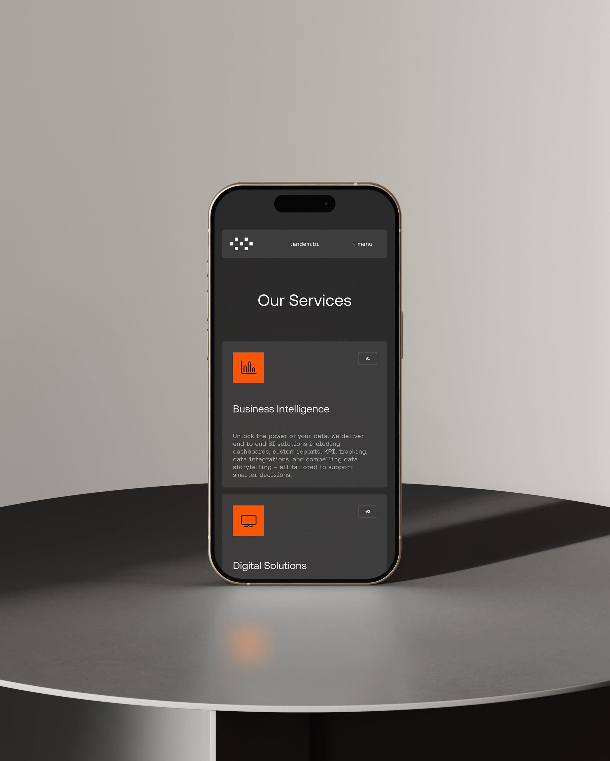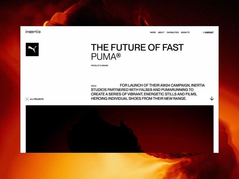 This design employs a dramatic high-contrast visual language, pairing deep shadows with intense orange lighting to create a dynamic and energetic atmosphere. The layout is clean and modern, using negative space effectively to focus attention on the core text and brand identity.