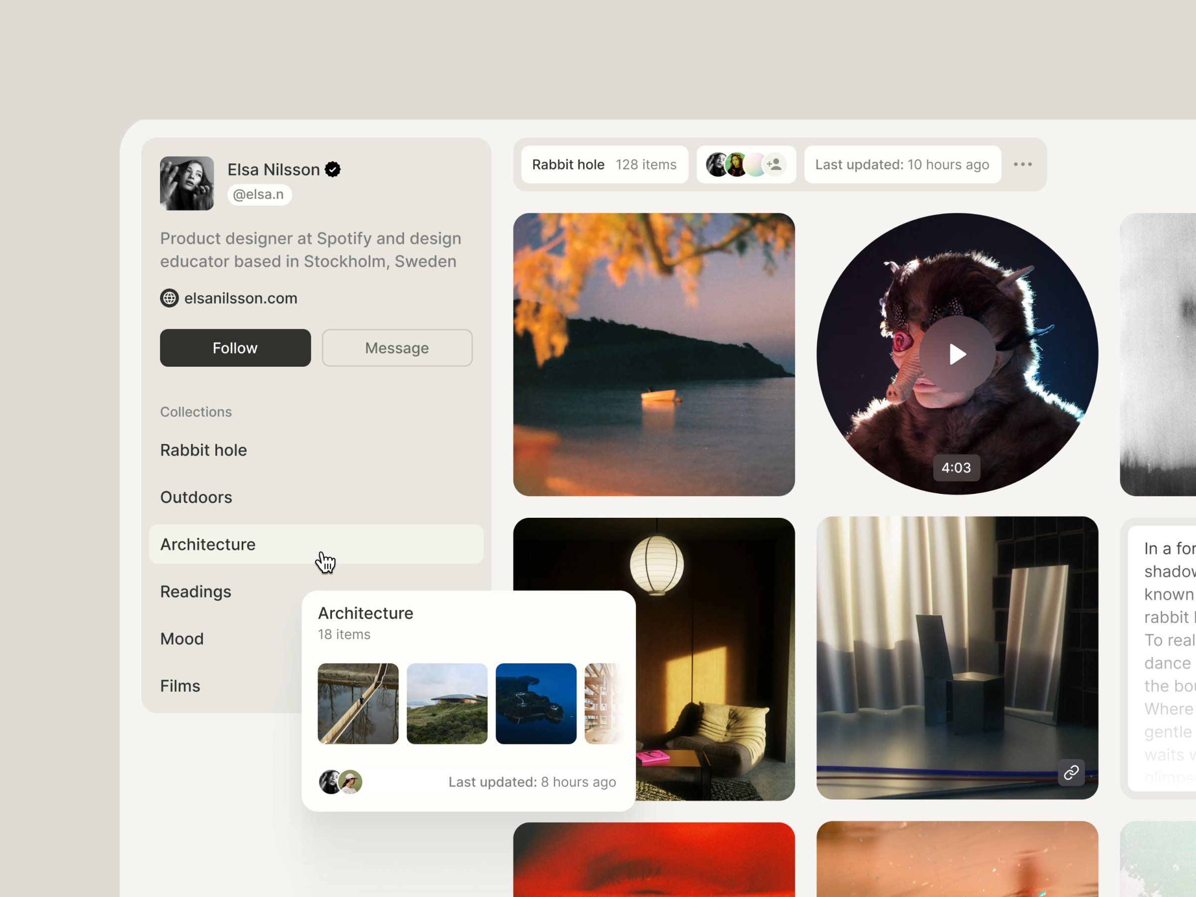 The image displays a clean, modern interface for a creative portfolio or social platform, characterized by a minimalist layout and high-quality photographic content. The design emphasizes visual storytelling through large, evocative images set against a neutral background.