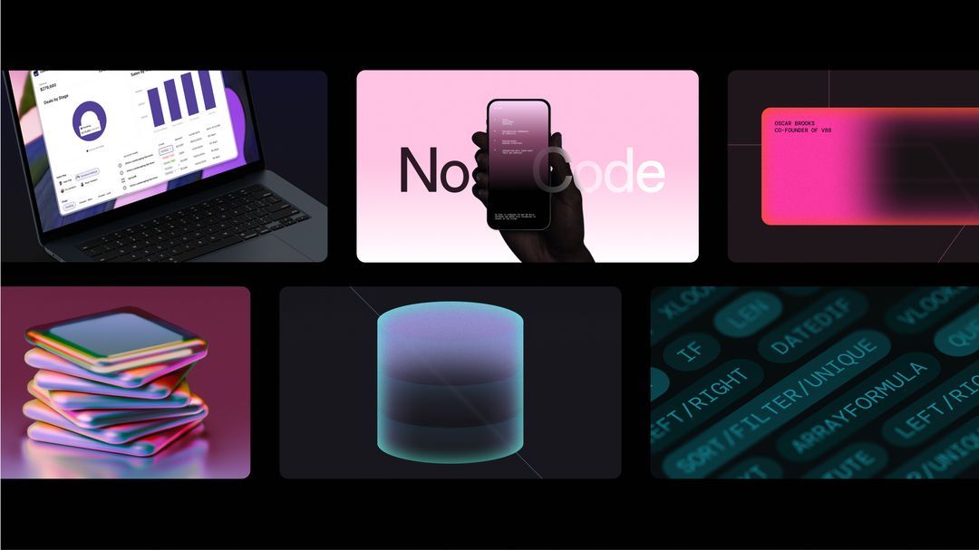 This visual collage presents a modern, technical aesthetic utilizing sharp contrasts and smooth gradients to convey concepts related to software development, data management, and mobile technology. The design effectively uses distinct panels to showcase various components—from UI mockups and code snippets to data stacks—creating a cohesive yet diverse portfolio of innovation.