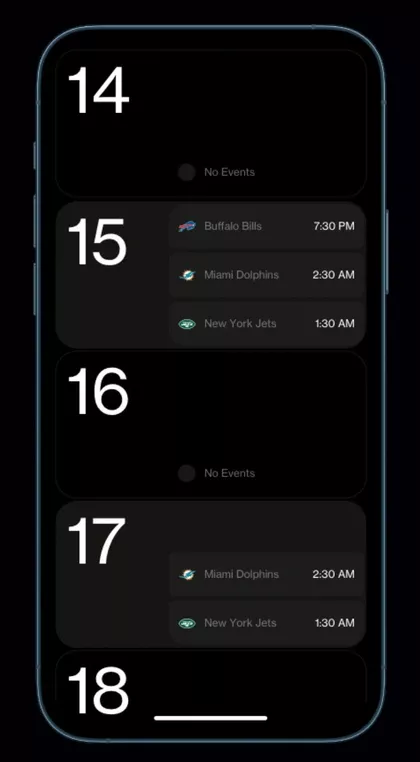 This interface demonstrates a clean, dark-mode design focused on delivering time-sensitive event information with high legibility. The visual language is minimalist, relying on strong contrast between the dark background and bright white text accented by a cool teal glow. The overall feel is professional, organized, and highly functional for quick data consumption.