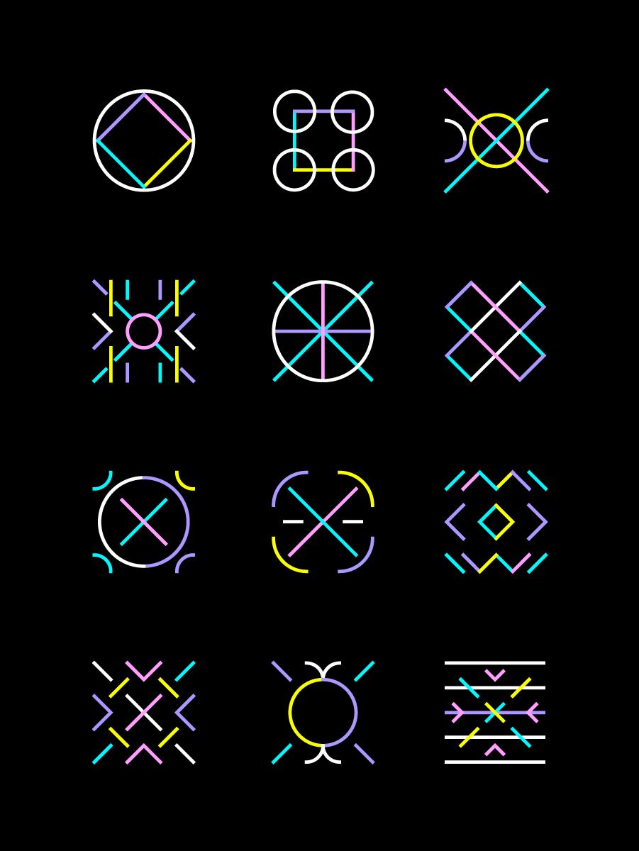 This set of images features a collection of delicate, abstract geometric line art symbols arranged in a grid. The design utilizes fine continuous lines and vibrant, contrasting colors to create a modern, playful, and decorative visual language.