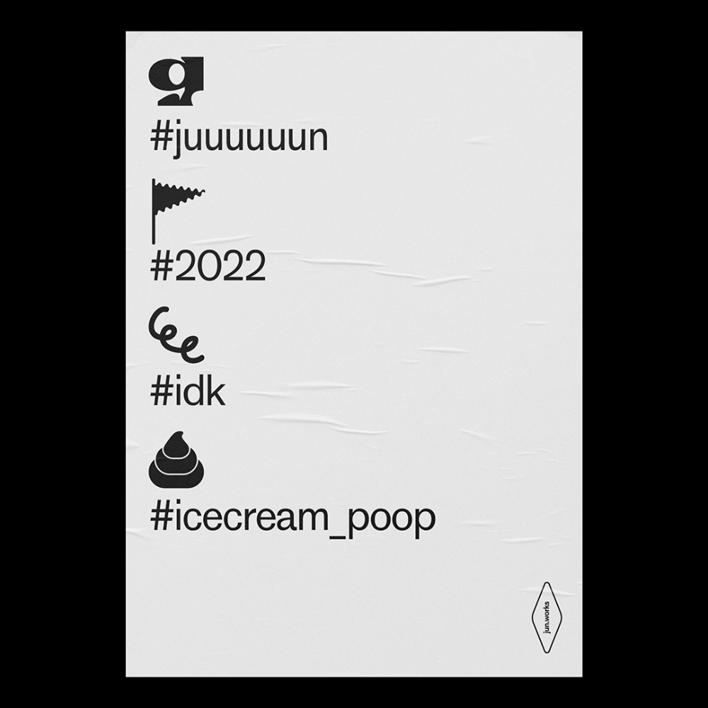 A minimalist, contemporary design featuring a collection of hashtags and small icon illustrations arranged vertically on a light gray background. The layout uses negative space effectively, combining playful internet culture references with clean typography and subtle graphic elements.