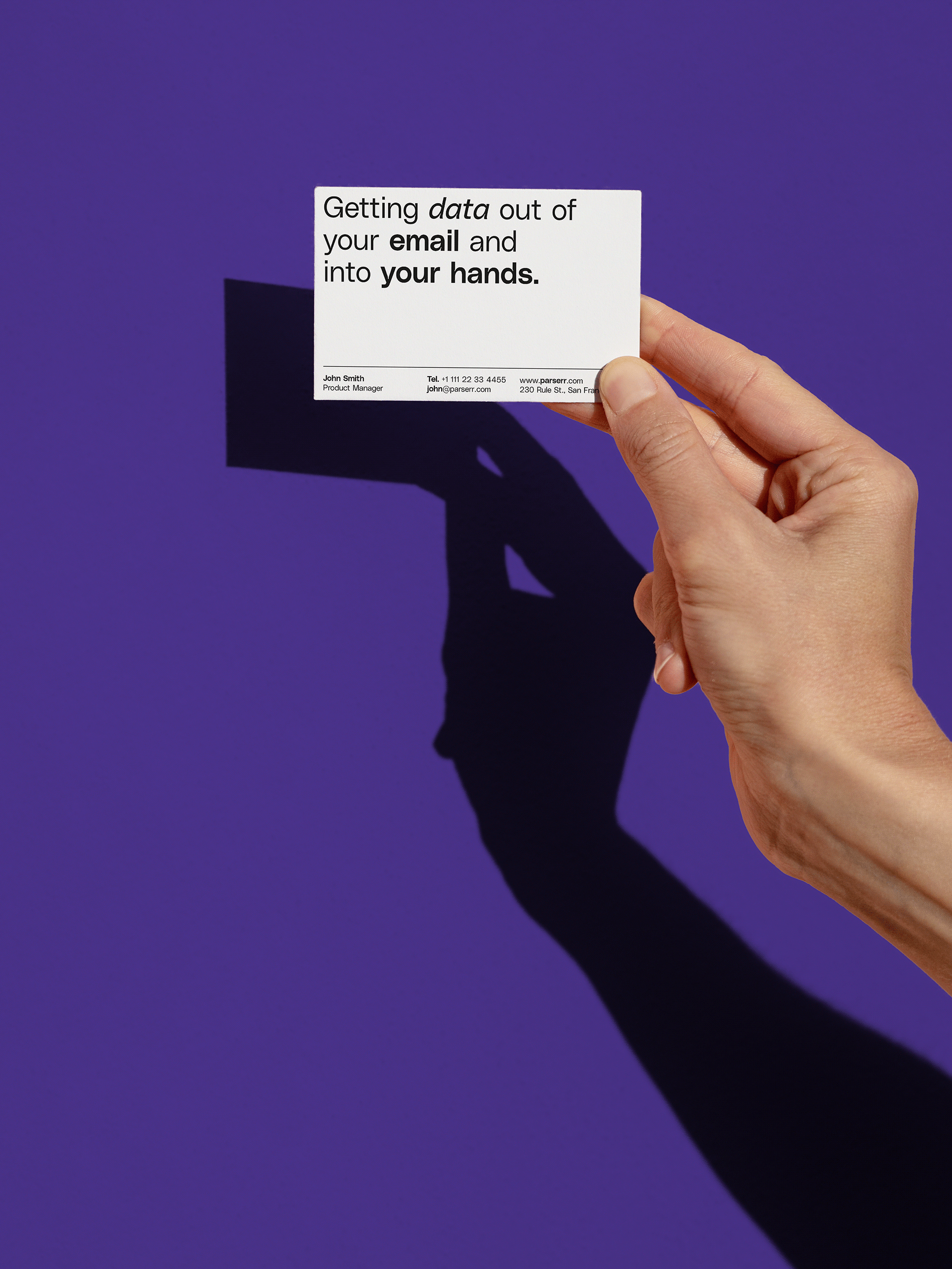 The image features a stark, minimalist composition focusing on the act of physically extracting information from a digital medium (email) into a tangible form. The visual language is clean and direct, using high contrast between the white card and the deep purple background to draw immediate attention to the subject.
