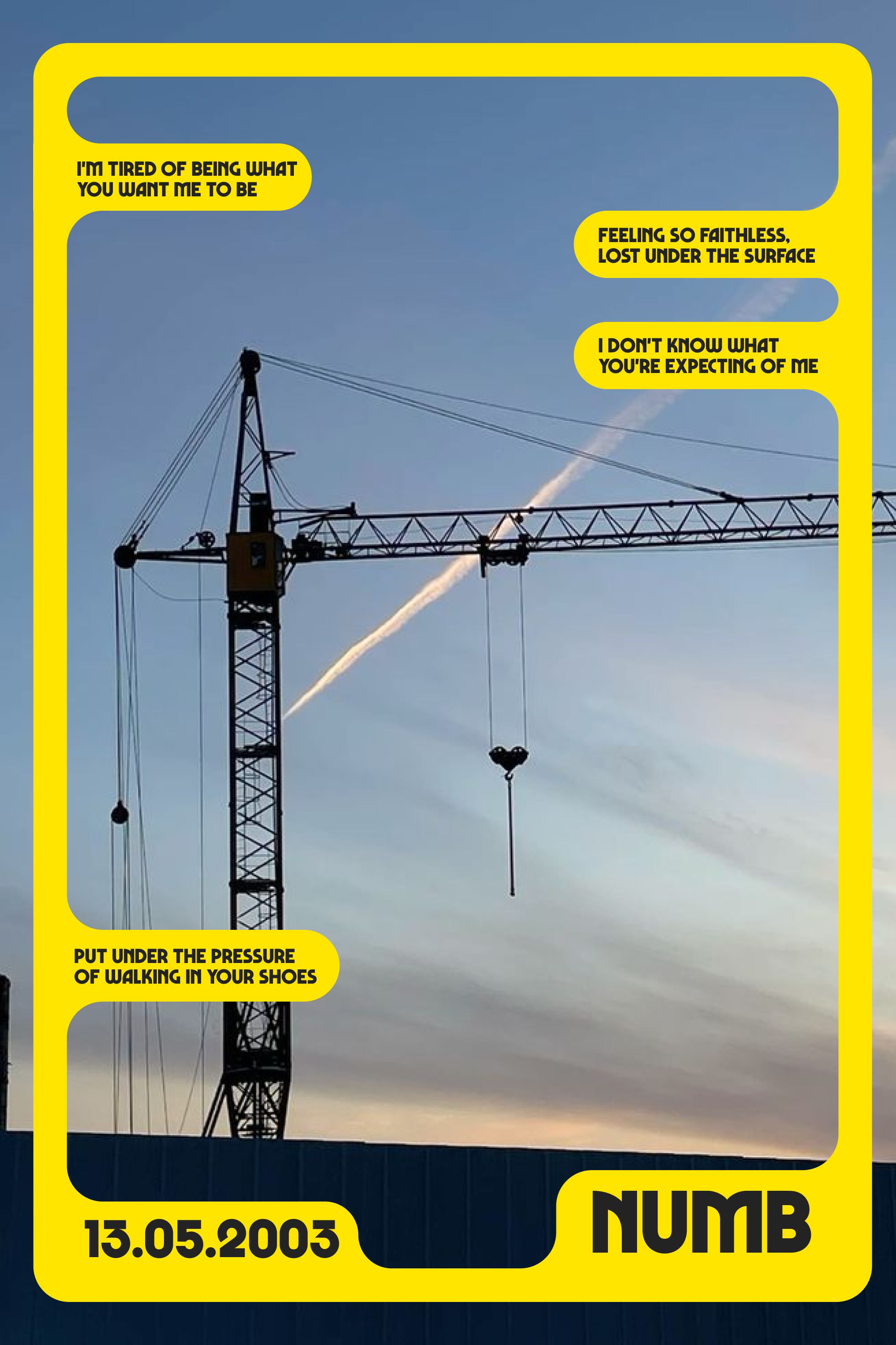 The poster employs a stark, high-contrast design using a limited color palette to convey a sense of pressure and existential fatigue. The visual language is direct, pairing stark text with an industrial element to create a feeling of heavy scrutiny or impending force.