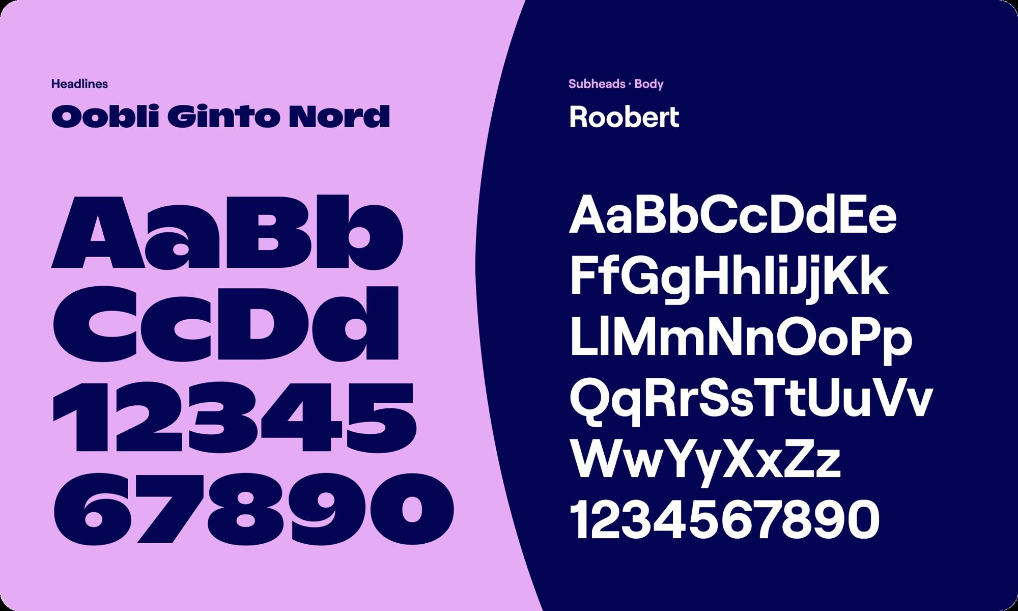 The design features a stark, high-contrast pairing of a soft lavender background with a deep indigo section, utilizing a highly stylized, blocky, and almost coded typeface for the main content. The visual language is modern, structured, and emphasizes a clear division between informational elements.