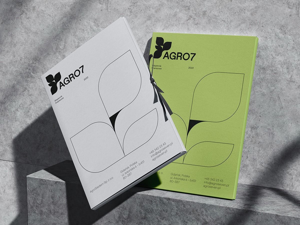 Minimalist branding and packaging design for AGRO7, featuring a clean botanical aesthetic with organic leaf-shaped forms. The design employs a stark contrast between white and lime green backgrounds, creating a modern, eco-conscious visual identity with strong geometric simplicity.