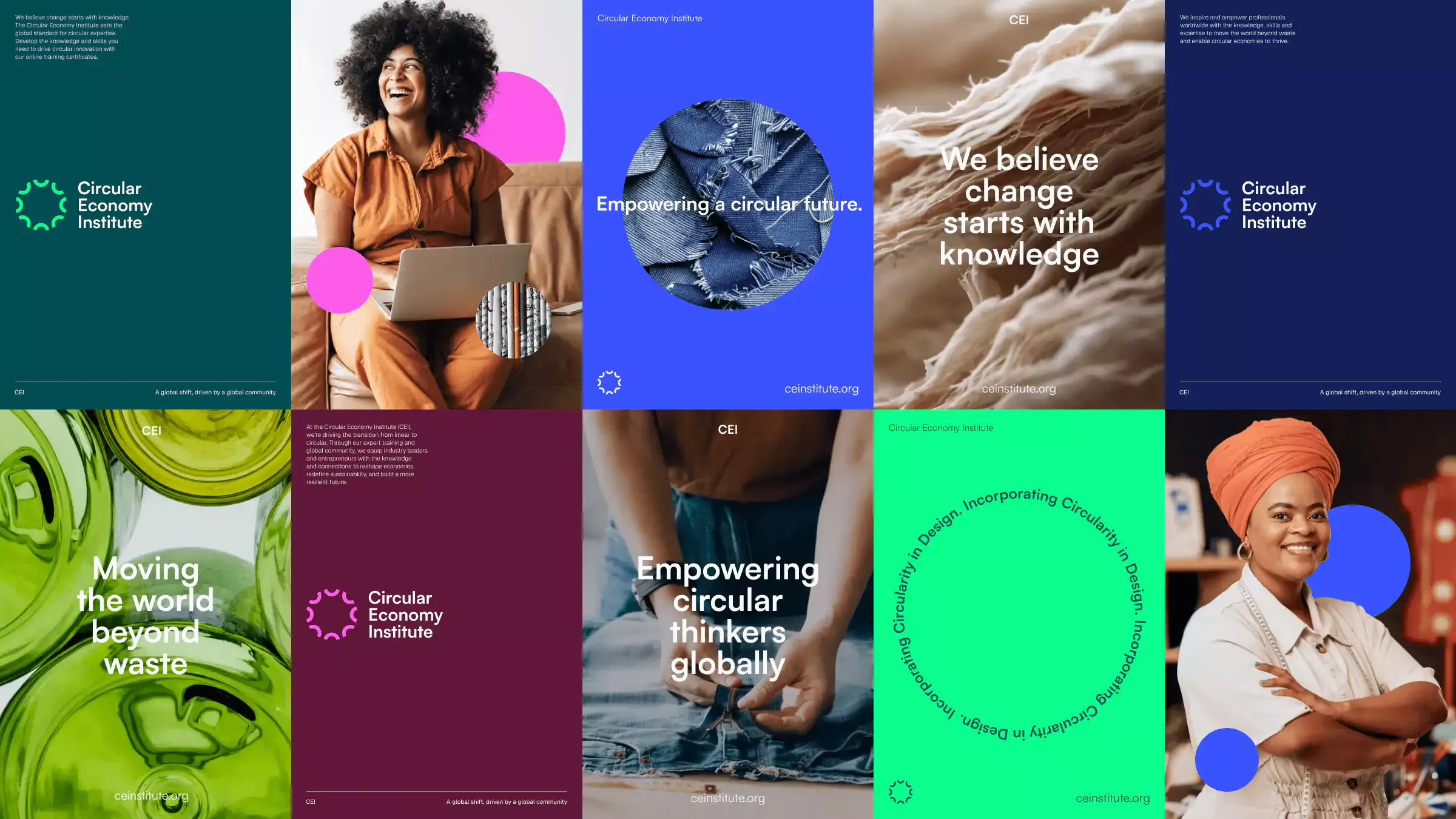 This visual collage presents a clean, modern, and professional aesthetic focused on environmental sustainability and circular economy principles. The design utilizes a balanced grid structure with vibrant yet muted colors to convey trust and innovation in the field.