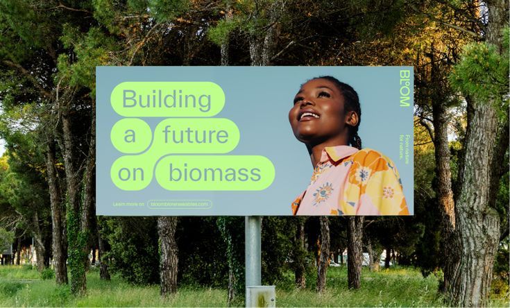A contemporary public billboard featuring a clean, modern design with bold typography and a vibrant color scheme. The composition combines aspirational messaging about sustainable energy with a portrait of a smiling individual, creating an optimistic and forward-thinking visual narrative about biomass technology.